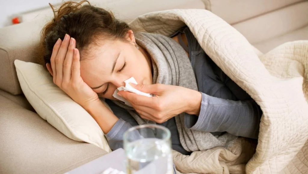 Симптомы гриппа проявляются в течение нескольких часов после контакта с больным: повышение температуры до 38-39°С, першение в горле, головная боль, общая слабость, мышечные боли и ломота в суставах, боль при движении глазами, светобоязнь, слезотечение, суховатый кашель, заложенность и незначительные слизистые выделения из носа. Грипп опасен осложнениями: бронхитами, пневмонией.