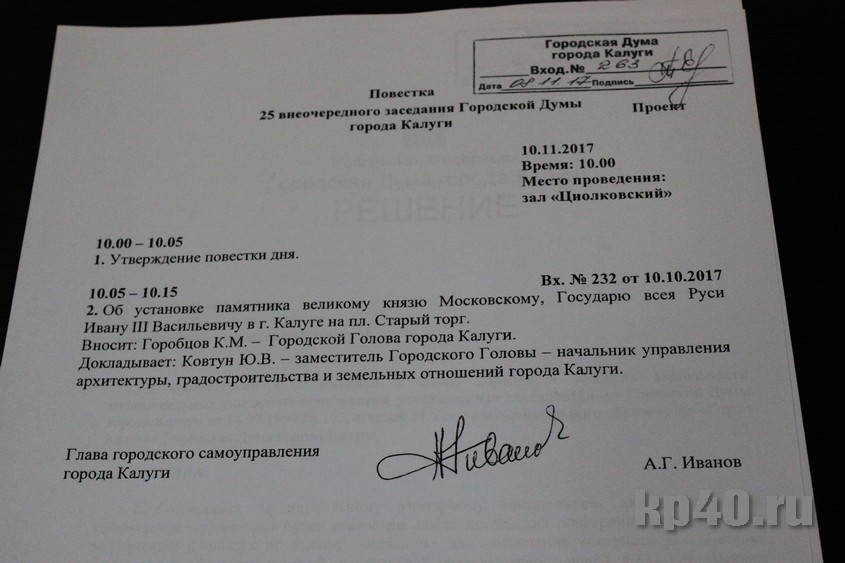 В пятницу, 10 ноября, депутаты городской Думы Калуги собрались на внеочередное заседание и подавляющим большинством одобрили установку памятника князю Ивану III на площади Старый Торг. Примечательно, что это случилось за два дня до открытия монумента. При том, что работы по строительству фундамента под постамент велись с середины сентября.