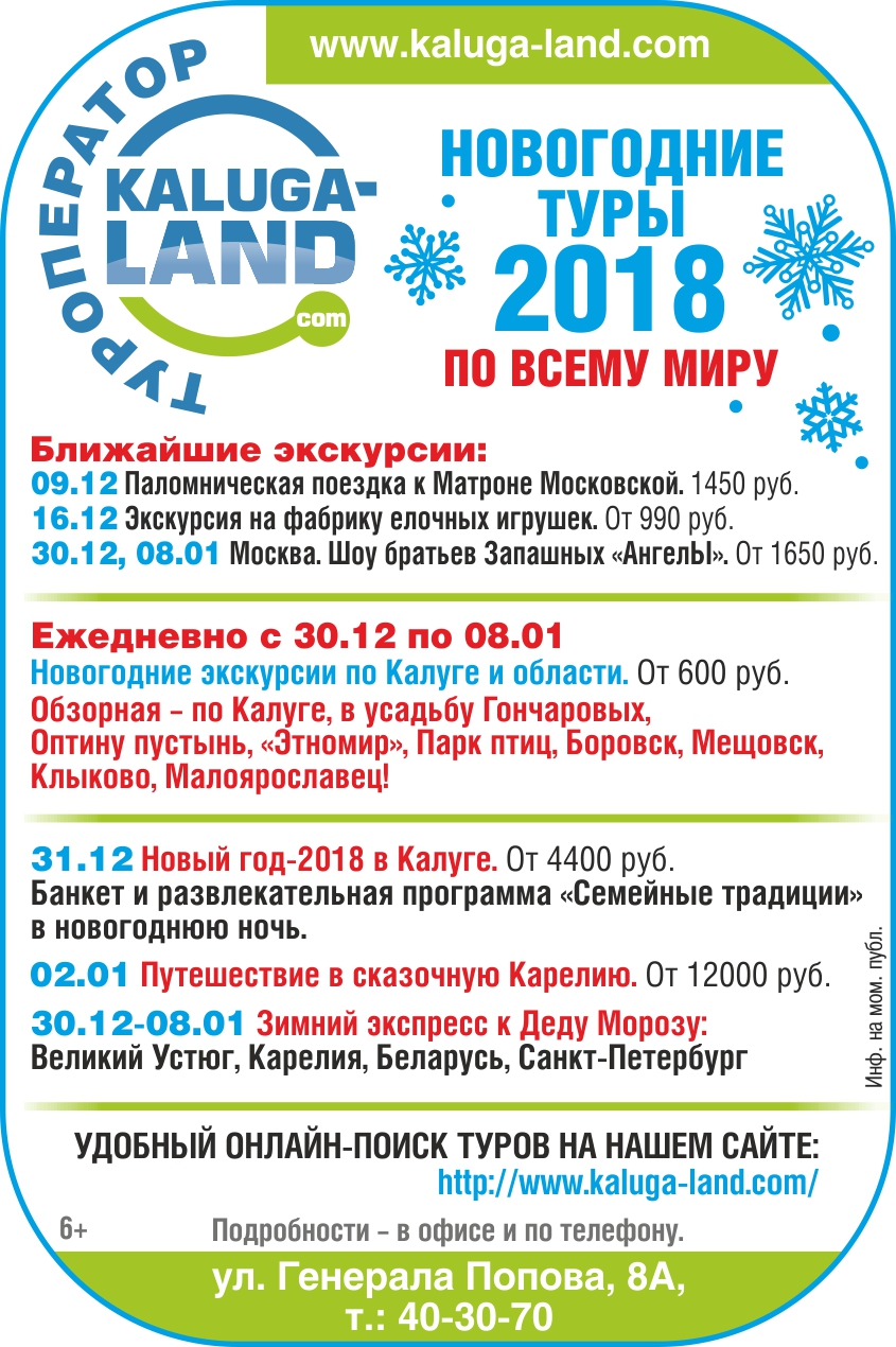 В сентябре Калуга вошла в национальный туристический проект «Императорский маршрут», который пройдет по местам, связанным с семьей последнего русского императора. Организаторы проекта смогли преодолеть то обстоятельство, что Николай II заезжал в Калугу всего один раз и пробыл тут около двух часов, и поставили наш город в один ряд с Орлом, Калининградом, Нижним Новгородом, Вологдой, Казанью, Сыктывкаром, Уфой, Тверью и полуостровом Крым. Так что теперь у калужан есть повод проехаться по этим прекрасным русским городам, тем более что калужские туроператоры готовы в этом помочь.