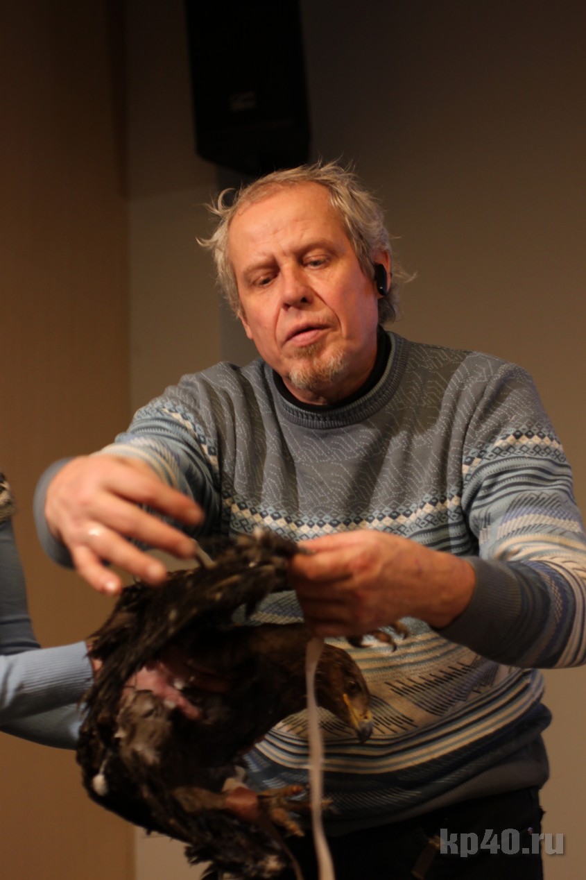 Показали присутствующим существо, которое когда- то было прекрасной хищной птицей. Из-за человеческой жестокости малый подорлик стал похож на мочалку. У птицы практически нет перьев.
