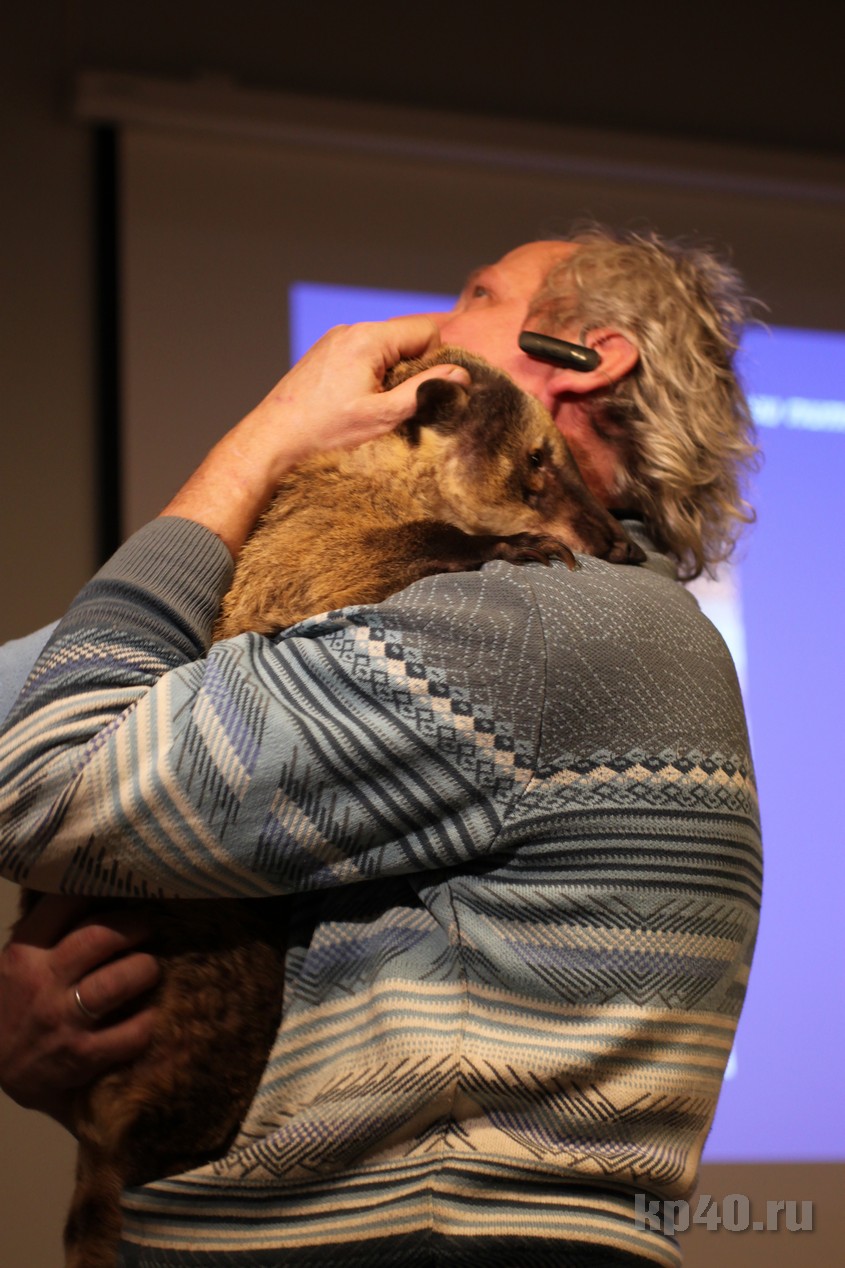 - Родственниками енота является наш цирковой артист носуха Цветочек, - этими словами Вероника достаёт из переноски животное. – Этому старичку 11 лет. Сейчас он оброс шерстью, а когда мы его забрали, был лысоват. В цирках не всегда хорошо смотрят за животными, неправильно кормят.