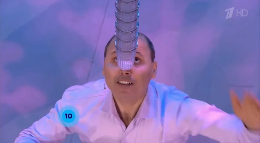 В этой программе он 40 секунд держал на носу 50 стаканов - это около 12 килограммов. С таким достижением Владимир попал в Книгу рекордов России.