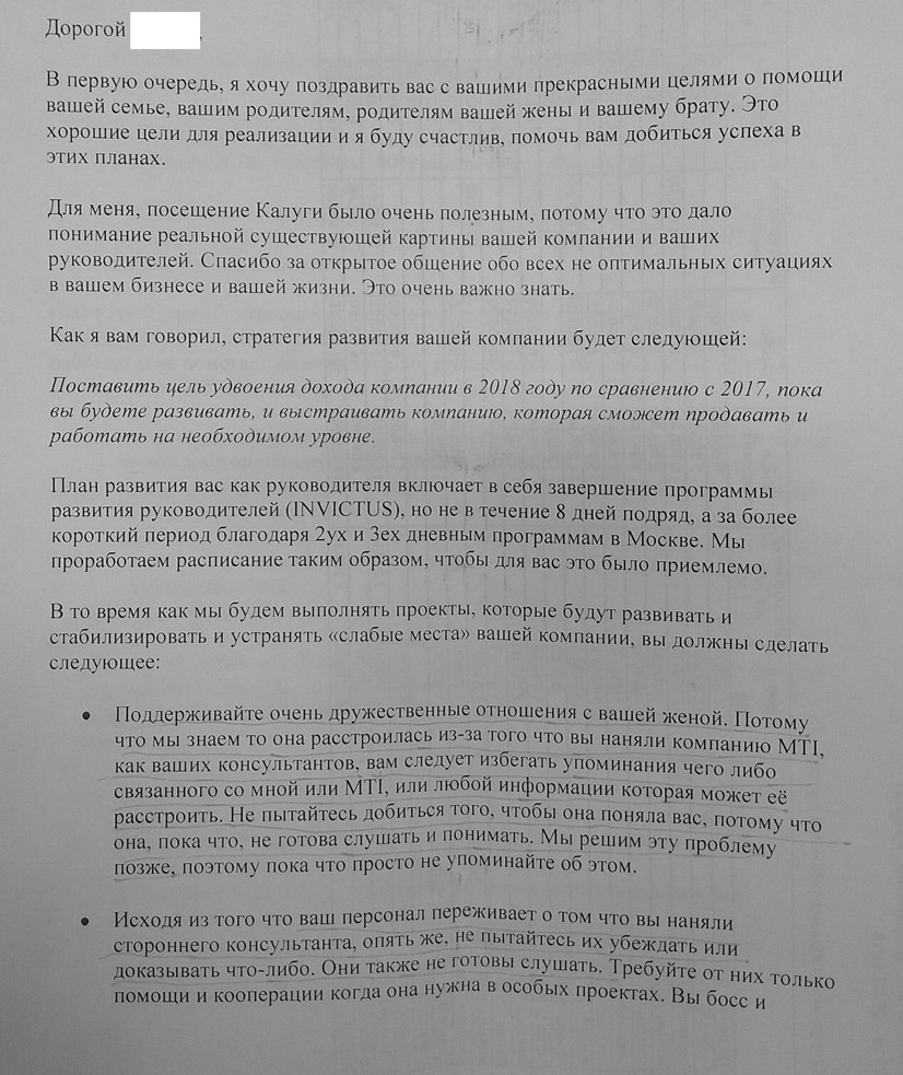 В письмах от тренера содержались четкие инструкции по отстранению Василия от управления предприятием. А в одном из них даже намекалось, что следующим шагом будет отстранение от бизнеса жены «реформатора»…