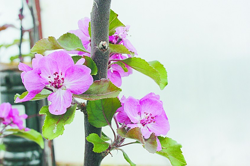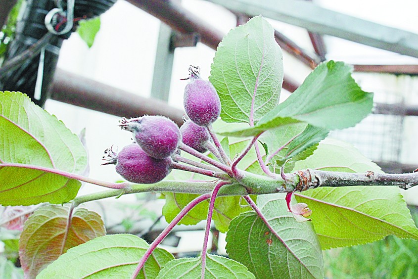Среди тоненьких, только набирающих силу саженцев выделяется раскидистое дерево. Мало того, что оно растёт в углу поликарбонатной теплицы, так одни его ветви покрыты пышными цветами, другие — маленькими бордовыми яблоками.