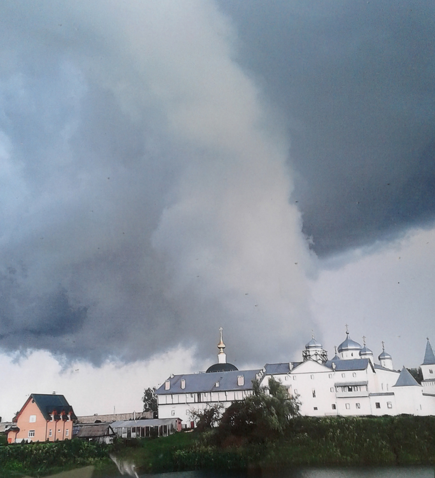 - В Свято-Георгиевском монастыре в Мещовске Калужской области хранятся чудотворные мощи юродивого Андрея, - рассказал Алексей Урусов. - На фотографии, которая бережно хранится в монастыре, реальный смерч над обителью. Как поведали монахи, в этот момент они страстно молились святому Андрею Мещовскому в его часовне. Непогода прошла мимо, не причинив никакого вреда монастырю.