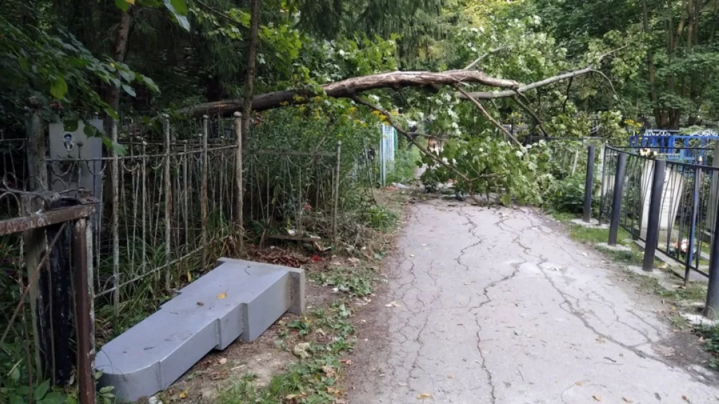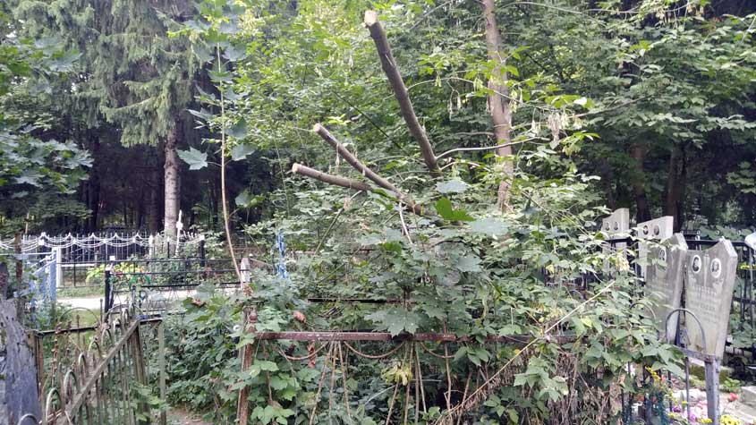 А в ходе урагана в середине августа, деревья повалио по всему кладбищу. Одно из них упало посередине прохода так, что ни машине не проехать, ни людям не пригнувшись не пройти.