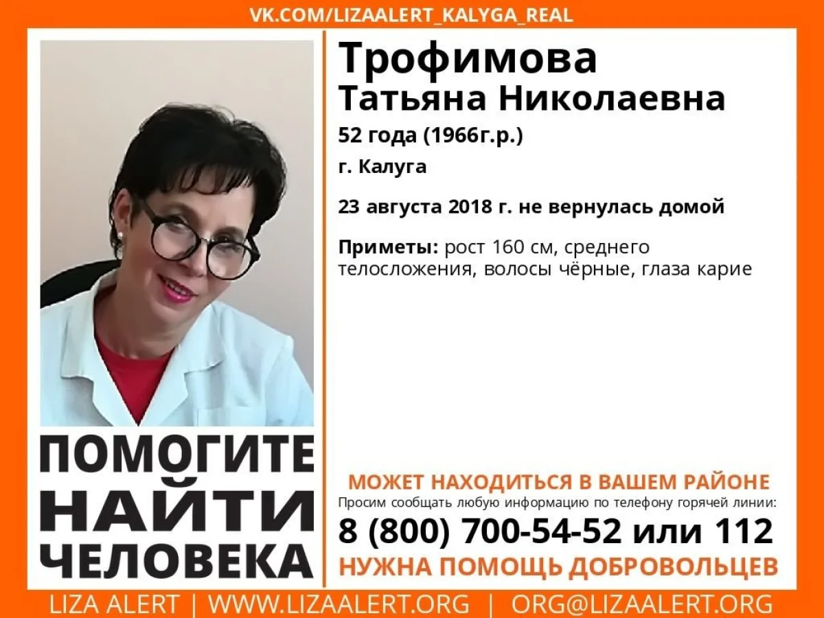 23 августа ушла из дома и до сих пор не вернулась 52-летняя Татьяна ТРОФИМОВА, сообщает поисково-спасательный отряд «Лиза Алерт». Они обратились к общественности с просьбой помочь в розыске пропавшей.