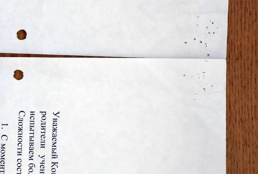 Помимо этого, невооруженным глазом было видно, что страницы заявления многократно раскреплялись и снова скреплялись степлером. То есть теоретически родители могли поставить подписи под одним документом, а затем страницы с ним «разлучили» и пришпилили степлером к другому. Потом снова открепили и присовокупили к третьему. И так далее, и тому подобное неизвестно сколько раз.
