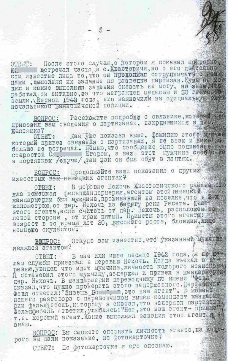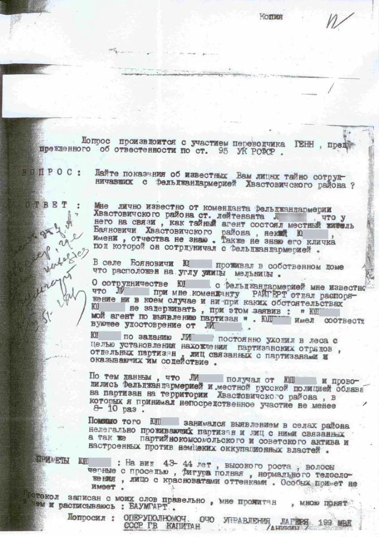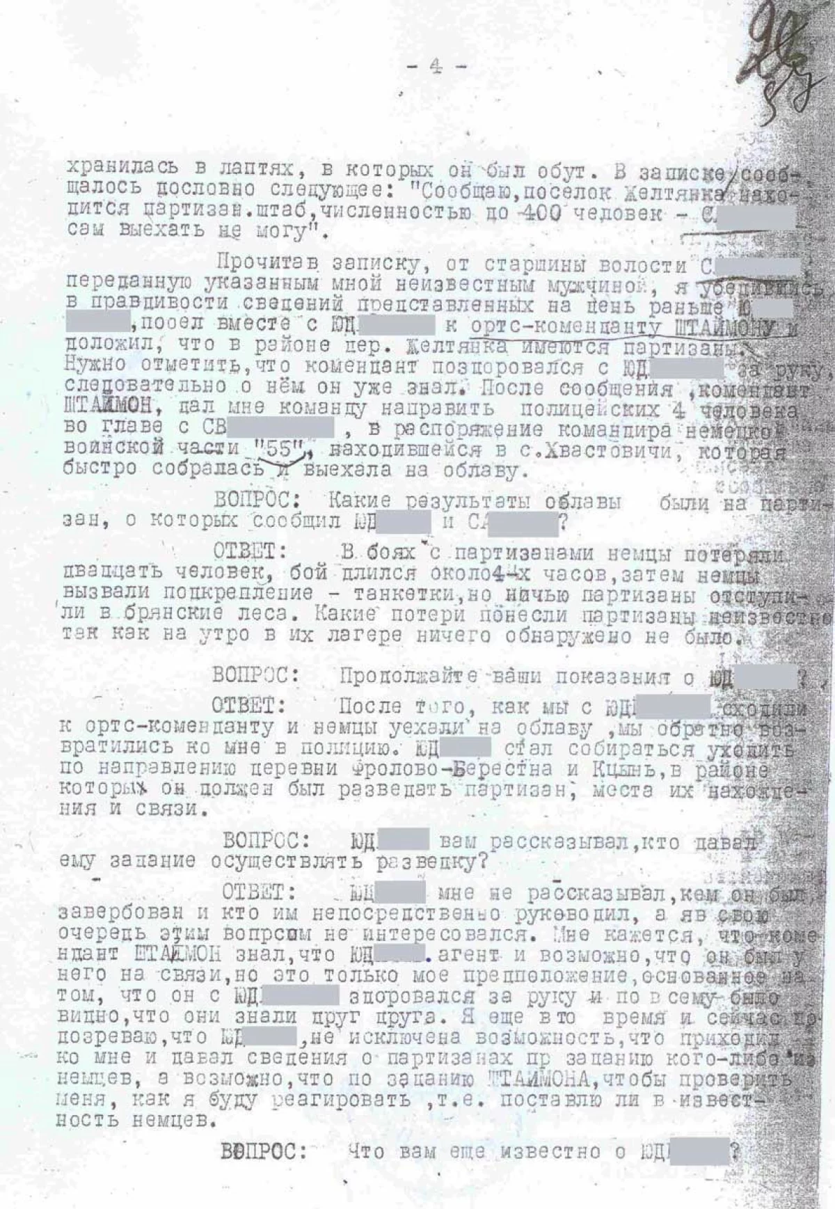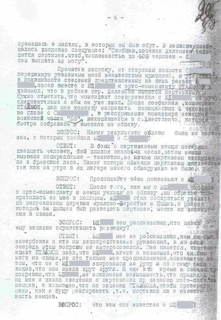 Согласно показаниям бургомистра, некто Юдин (имя изменено, - прим. ред.) ещё в бытность его главным полицаем Хвастовичского района, пришел к нему и сообщил, что в поселке Желтянка находится штаб партизан. Общая их численность – 400 человек.