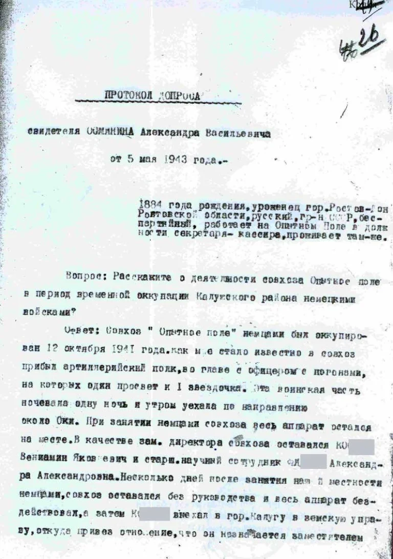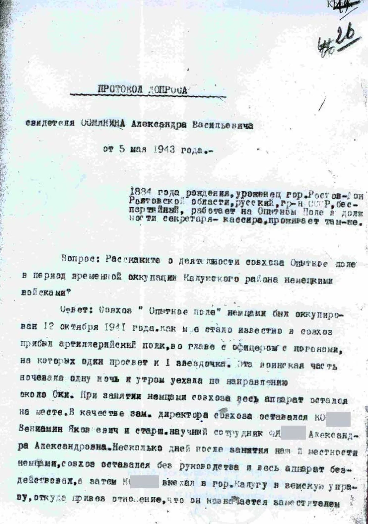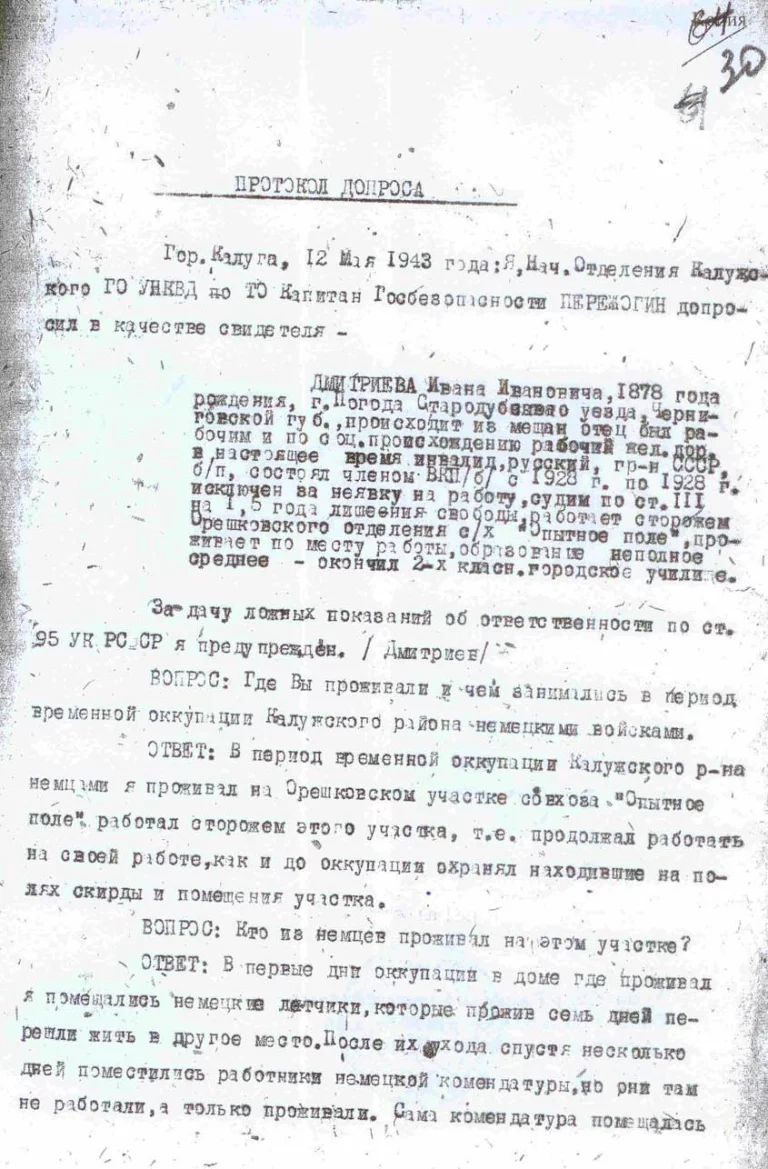Выделяется из кипы рассекреченных документов и часть из протокола допроса некоего Ивана Ивановича Дмитриева 1878 года рождения. Его 12 мая 1943 года капитан госбезопасности допросил в качестве свидетеля по делу о выявлении коллаборационистов, работавших на нацистов во все том же совхозе Опытное поле.