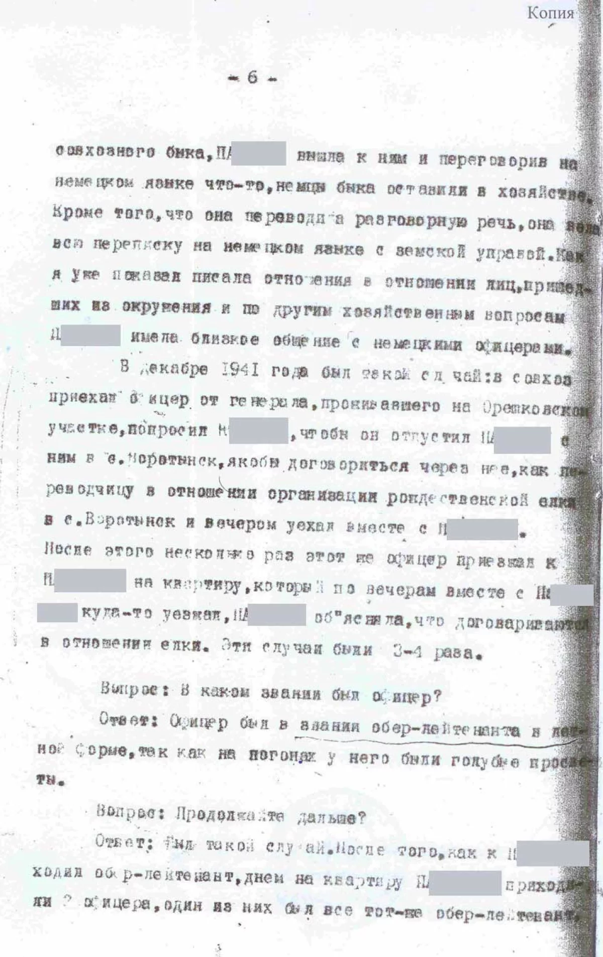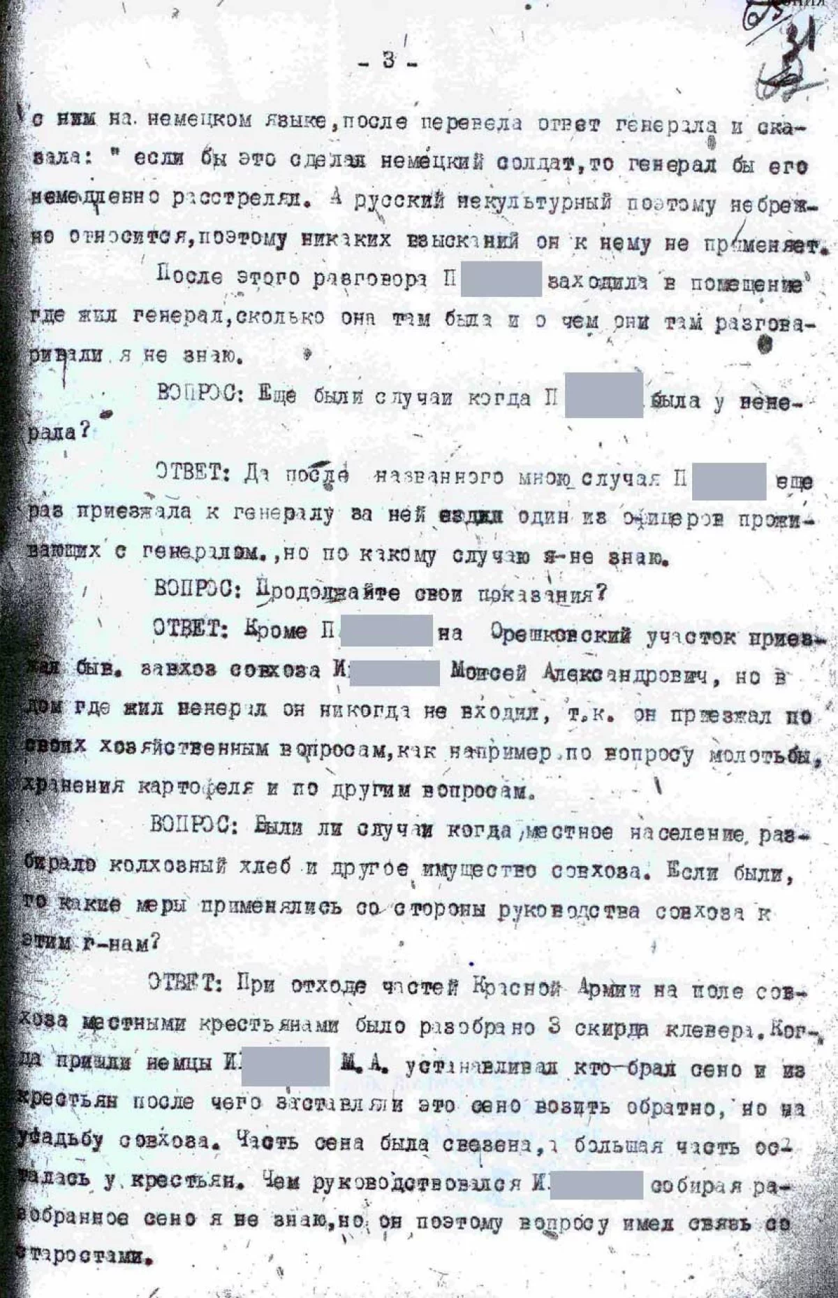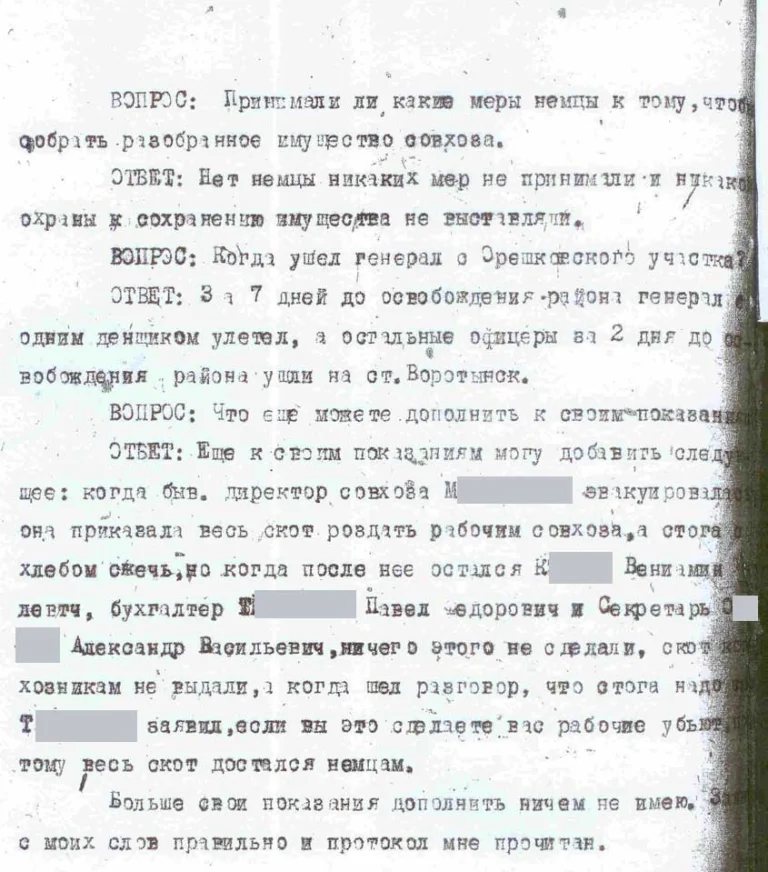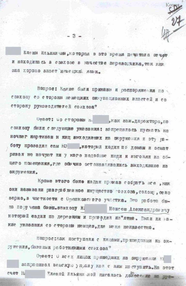 - Со стороны Козина (имя изменено – прим.ред.), как замдиректора, по совхозу были следующие указания: воспрещалось пускать на ночлег партизан и лиц, выходивших из окружения и эту работу проводил Козин, который ходил по домам осматривая, не ночуют ли у кого подобные люди, и выгонял из общего помещения, где обычно останавливались выходившие из окружения.