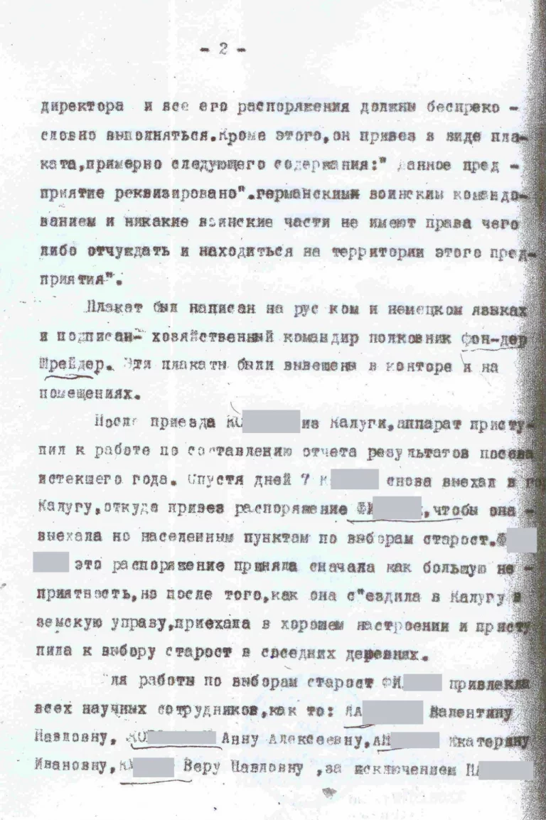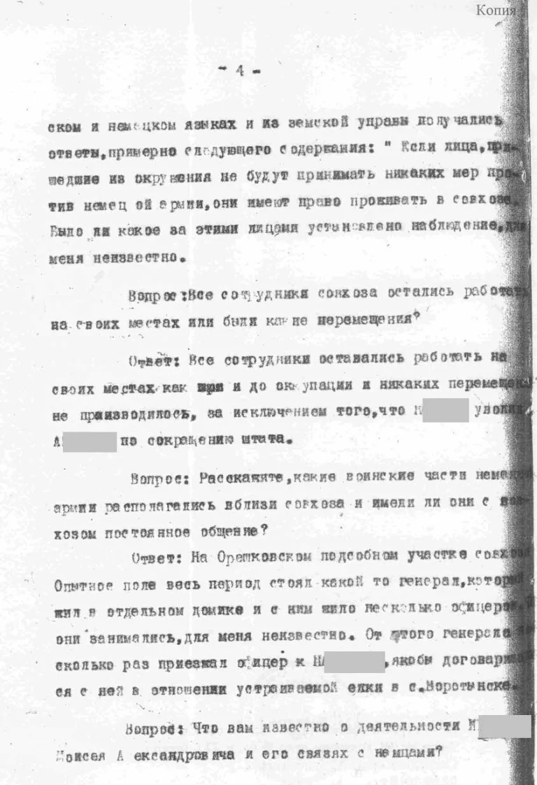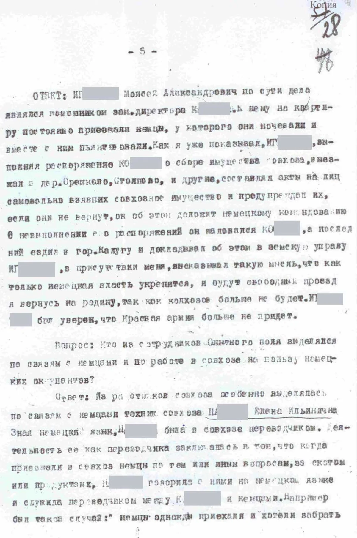 - О всех лицах, пришедших из окружения, Козин запрашивал земскую управу как с ним поступить. На этот счет Пасиной (имя изменено – прим. ред.) писалось донесение на русском и немецком языках и из земской управы получались ответы, примерно следующего содержания: «Если лица, пришедшие из окружения, не будут принимать никаких мер против немецкой армии, они имеют право проживать в совхозе».