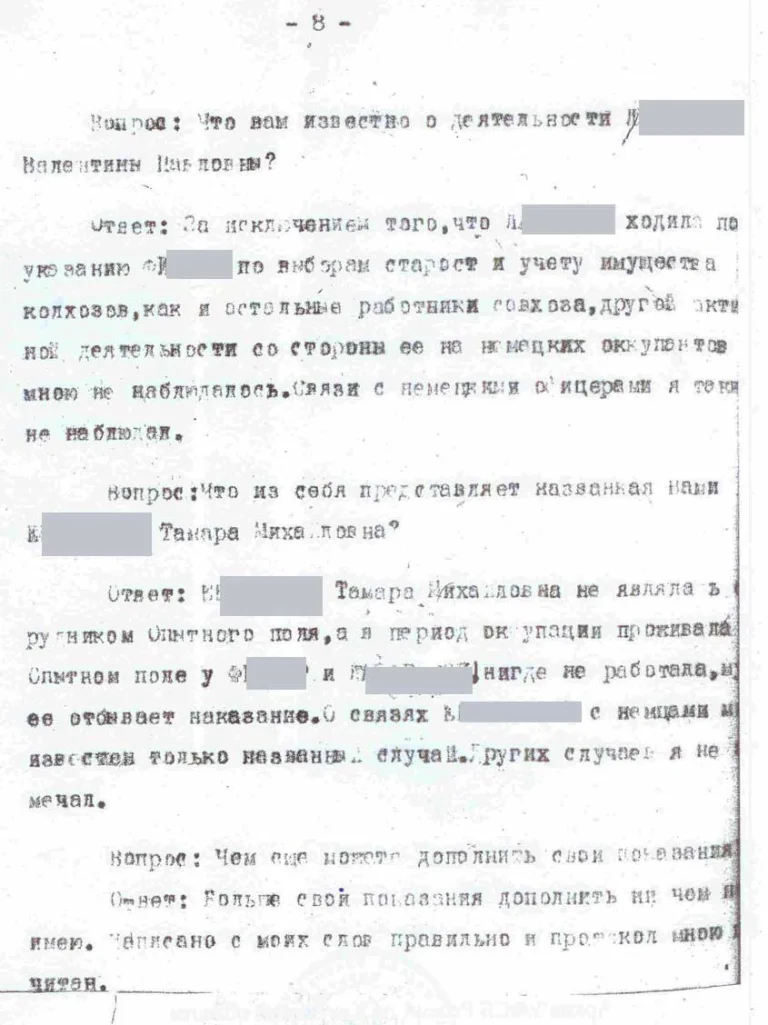 О том, что поиск предателей чекисты продолжали еще долгие годы после войны, говорят и даты некоторых допросов. Среди них встречаются проведенные уже в 50-х годах. Чекисты старались отследить судьбу каждого, кто был замечен в коллаборационизме.