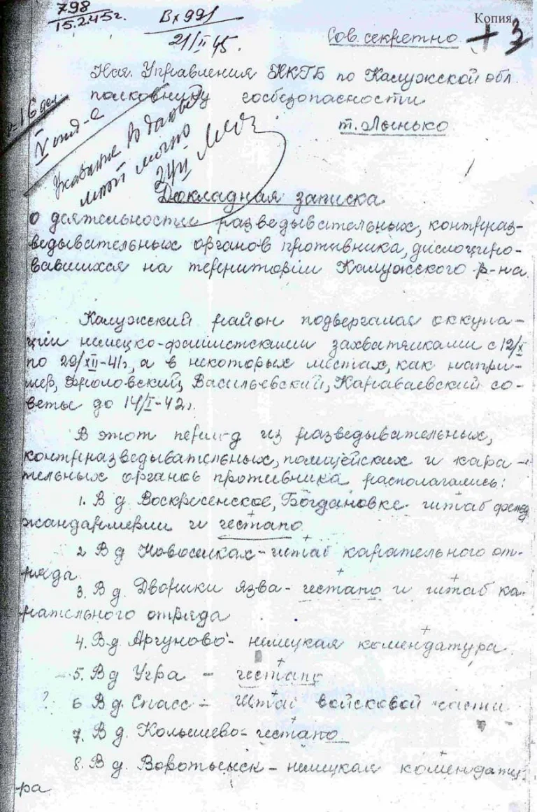 Один из документов под грифом «Сов. секретно», датированный 15.02.1945 рассказывает о том, где в Калуге и окрестностях располагались органы власти и разведки немецких оккупантов. Приводим список этих деревень: