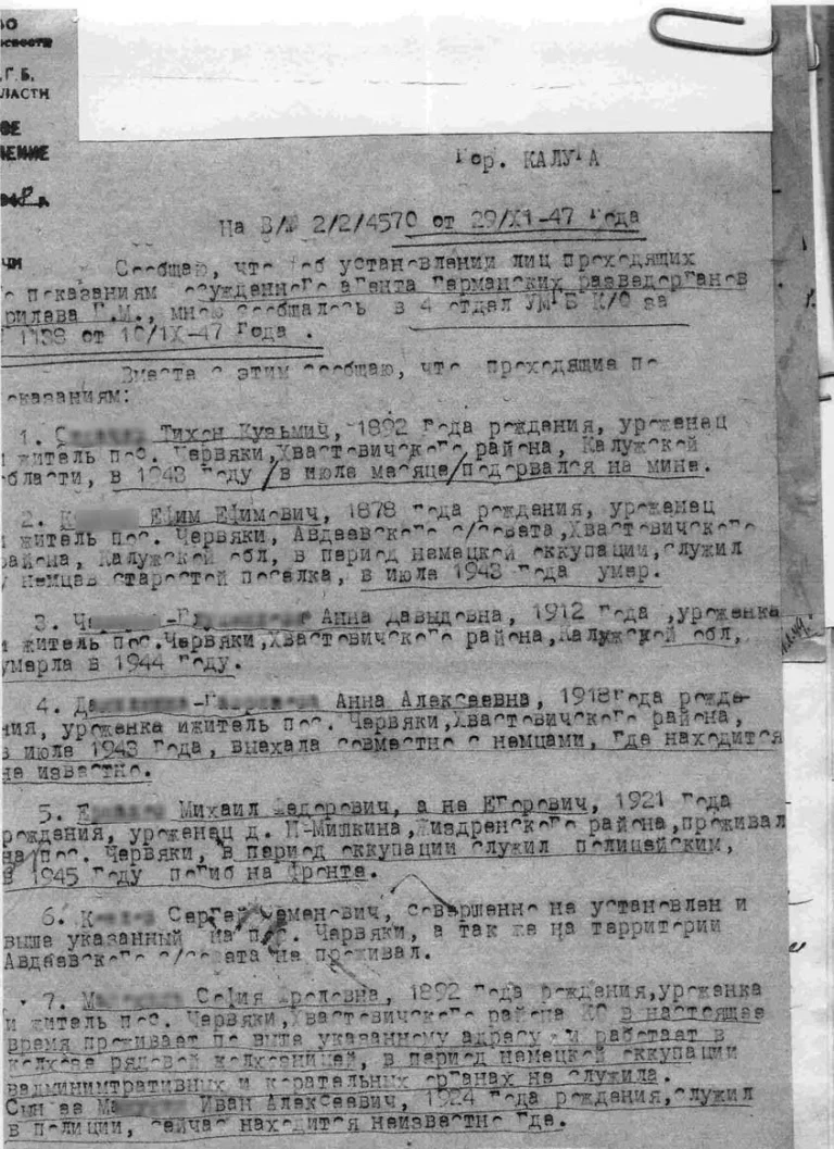 К примеру, есть в рассекреченных архивах справка от 29.11.1947 года. Её подготовили для следователя, который запросил у калужских чекистов данные о подозреваемых в предательстве. Те предоставили его с указанием того, какая судьба постигла этих людей: