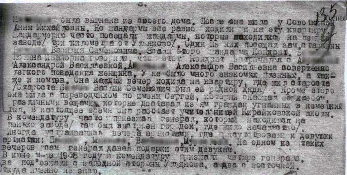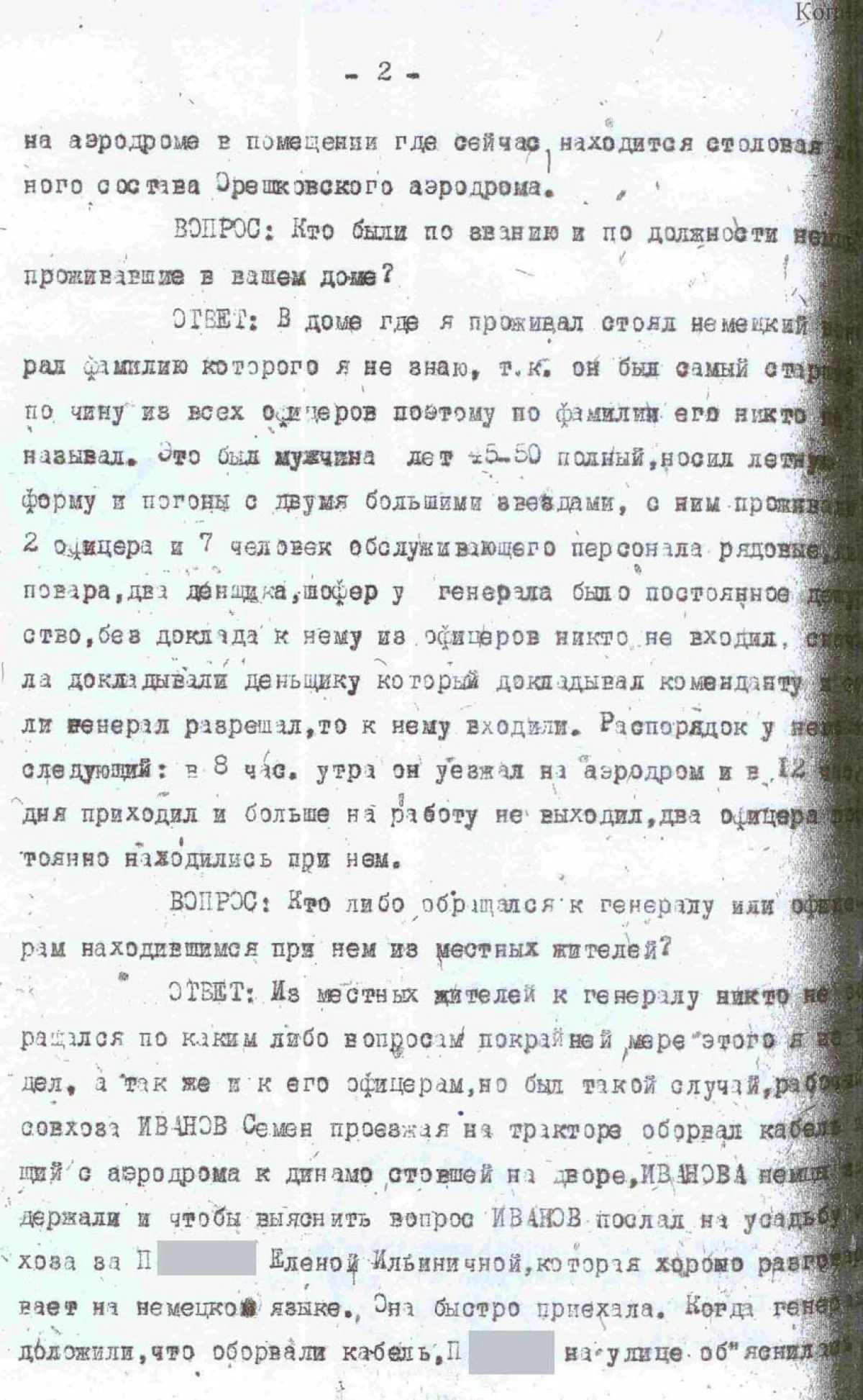 - Рабочий совхоза Иванов Семен проезжая на тракторе оборвал кабель, идущий от аэродрома к динамо, стоявшей на дворе, - рассказал чекисту Дмитриев. - Иванова немцы задержали и, чтобы выяснить вопрос, Иванов послал на усадьбу совхоза за Пасина, которая хорошо разговаривает на немецком языке. Она быстро приехала. Когда генералу доложили, что оборвали кабель, Пасина на улице объяснилась с ним на немецком языке. После перевела ответ генерала и сказала: «Если бы это сделал немецкий солдат, то генерал бы его немедленно расстрелял. А русский некультурный, потому небрежно относится, поэтому никаких взысканий он к нему не применяет».