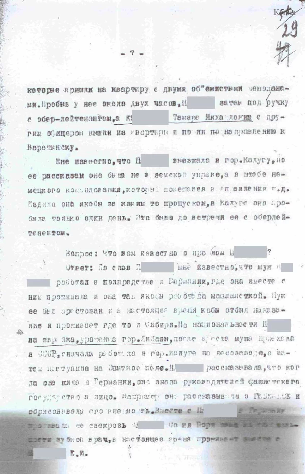 - София Ярославовна М., уроженка Хвастовичского района в настоящее время проживает по вышеуказанному адресу и работает в колхозе рядовой колхозницей. В период немецкой оккупации в административных и карательных органах не служила. Сын ее 1924 года рождения служил в полиции, где сейчас находится неизвестно.