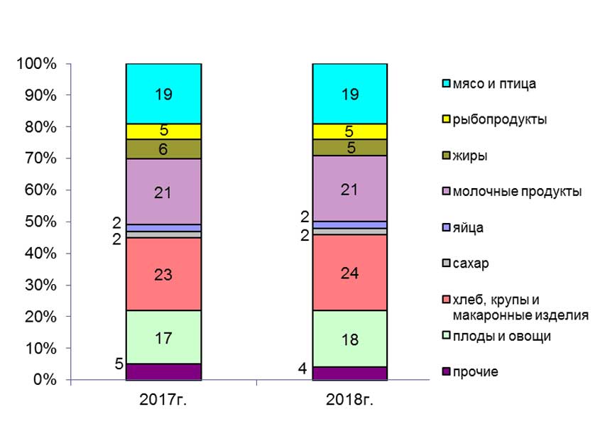 - В августе этого года по сравнению с августом 2017-го в структуре стоимости минимального набора повысилась доля хлеба, круп и макаронных изделий, плодов и овощей на 1 процентный пункт, - поясняется в докладе Калугастата. - Снизилась доля жиров, прочих продуктов на 1 процентный пункт. Доля мяса и птицы, рыбопродуктов, молочных продуктов, яиц и сахара в структуре стоимости не изменилась.