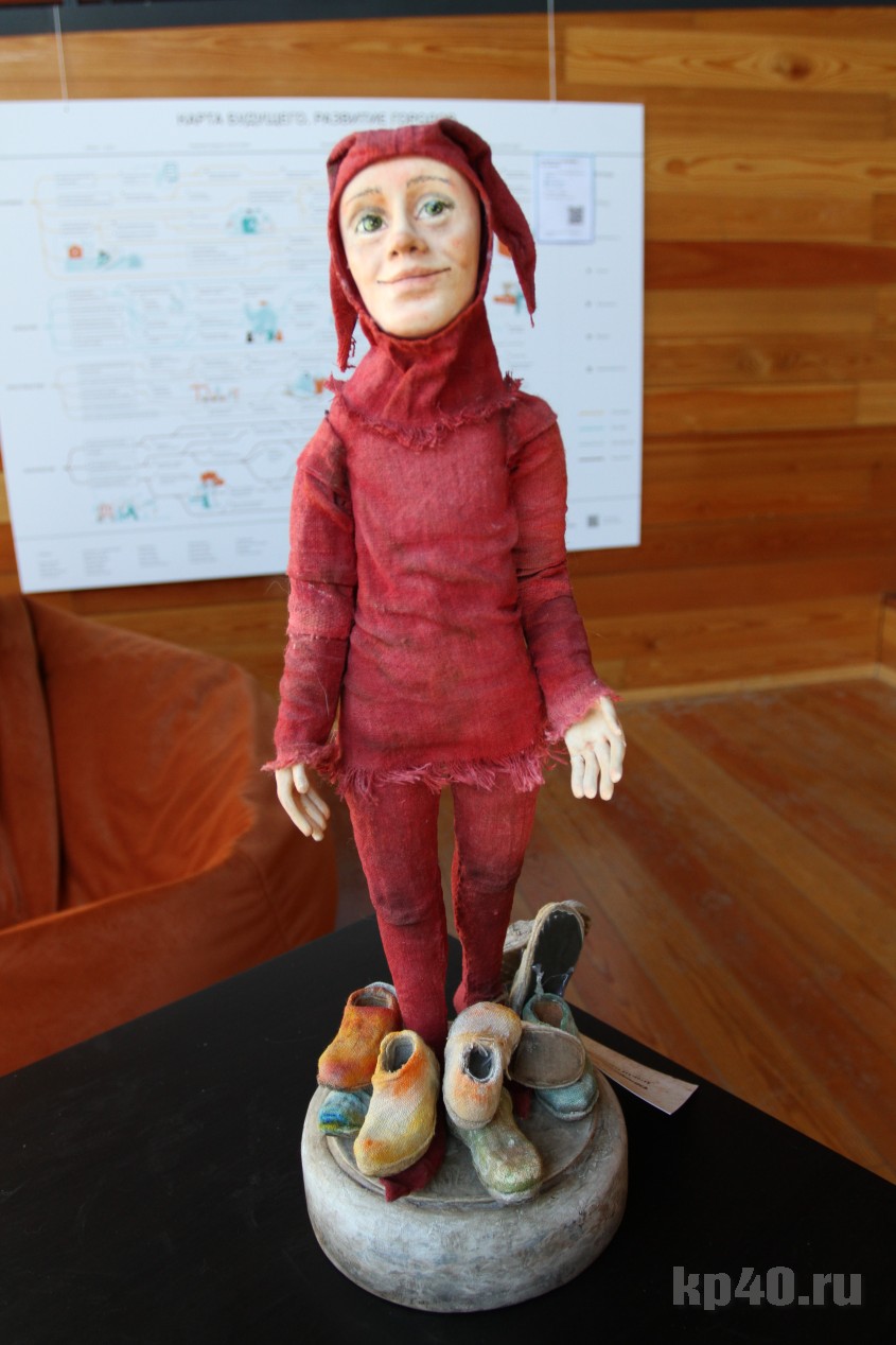 — Это Тиль Уленшпигель, герой одноимённого произведения немецкого писателя Эриха Кёстнера. Не бойтесь, его можно взять в руки, — говорит Марина. — Сначала Уленшпигель появился в народных легендах. А позже истории про него легли в основу произведений многих европейских авторов, не только Эриха Кёстнера. Уленшпигель— остроумный весельчак, постоянно придумывающий разные шалости. Ходил он в красном одеянии и дурацкой двухвостой шапке. Вокруг него неспроста много башмаков: в одной из историй рассказывается о его проделках с ними. Однажды Тиль попросил горожан снять левые башмаки, пообещав показать что-то интересное. Те удивлённо пожимали плечами: «Зачем ему это нужно?» А Уленшпигель натянул между домами канат, взобрался на него с кучей башмаков и, когда дошёл до середины, швырнул их вниз. Люди кинулись искать свою обувь, а так как ботинки у них были одинаковые, все переругались и передрались. Так Уленшпигель отомстил за то, что горожане хохотали над ним, когда он упал с каната в воду.