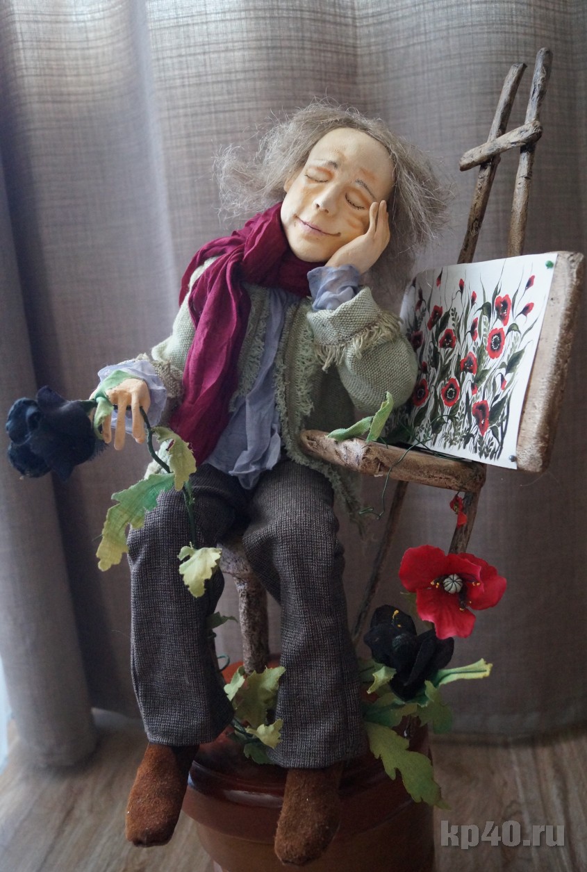 Работа «Вдохновение» для выставки «Греко-петербургские мифы». Необходимо было представить петербуржца в образе древнегреческого персонажа. Сколько же было перечитано мифов! В этой кукле как бы соединились питерский художник и бог сна Морфей. Художник уснул возле мольберта. Рука его опирается на чёрный мак — символ Морфея.