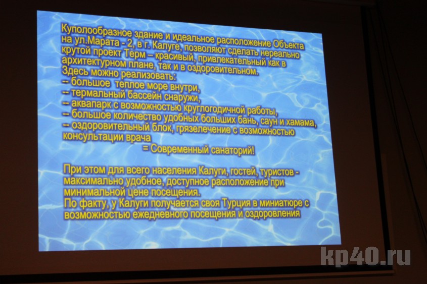 Калужане спросили, не боится ли инвестор, что через 5-10 лет властям придёт в голову на месте терм построить что-то другое, допустим, арену с тараканьими бегами.