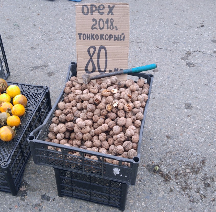 Майкопские цены на фермерские продукты в сравнении с калужскими выглядели поистине коммунистическими. Грецкий орех в скорлупе — 80 рублей за килограмм, а очищенный — 250. Сыр адыгейский — 200 рублей за кило. Свинина копчёная — 500 рублей. Да какая свинина! По плотности она может поспорить даже с бастурмой. А главное, в мясе не нашлось ни грамма воды, ни намёка на консерванты — только изумительный натуральный запах и вкус копчёного мяса. Как будто только вчера из деревенской коптильни. Собственно, так оно и оказалось на самом деле.