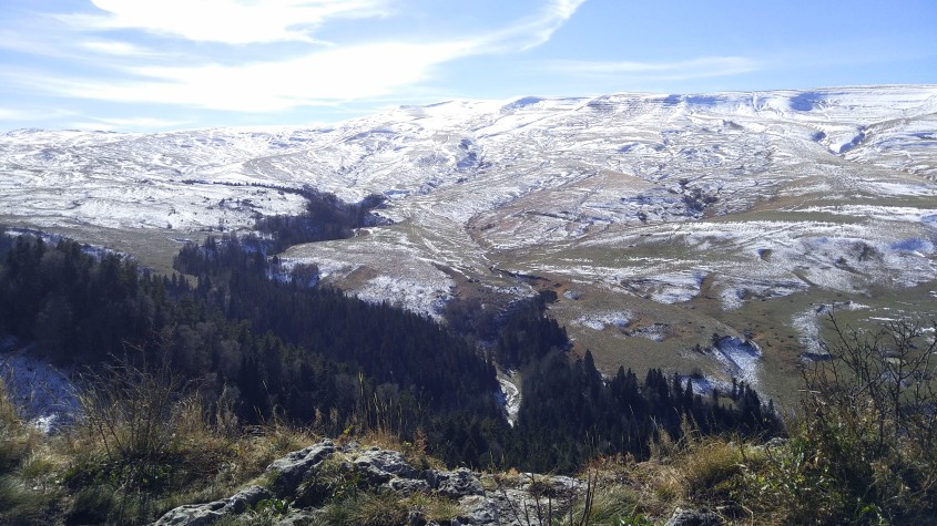 Плато Лаго-Наки. Серенькие пятнышки по центру и правее - это лошадки, которые пасутся на склоне. А в ущелье в лесу по центру и чуть слева живет медведь.