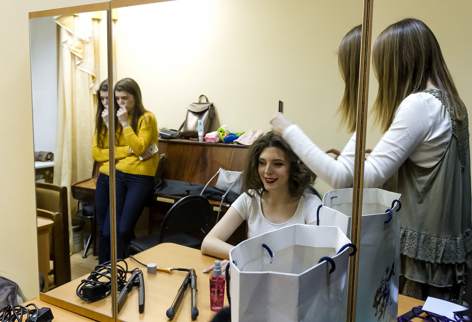 Пока заполнялся зал, претендентки готовились в гримёрных. Над одними трудились стилисты, другие ожидали очередь за небольшим перекусом: красота - дело энергозатратное.