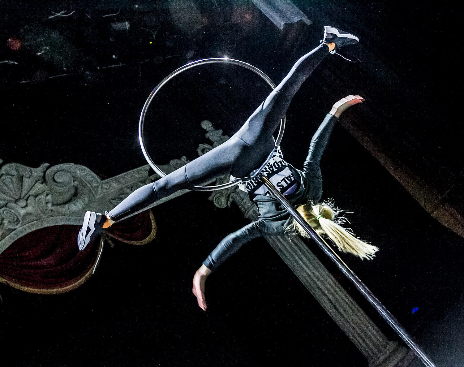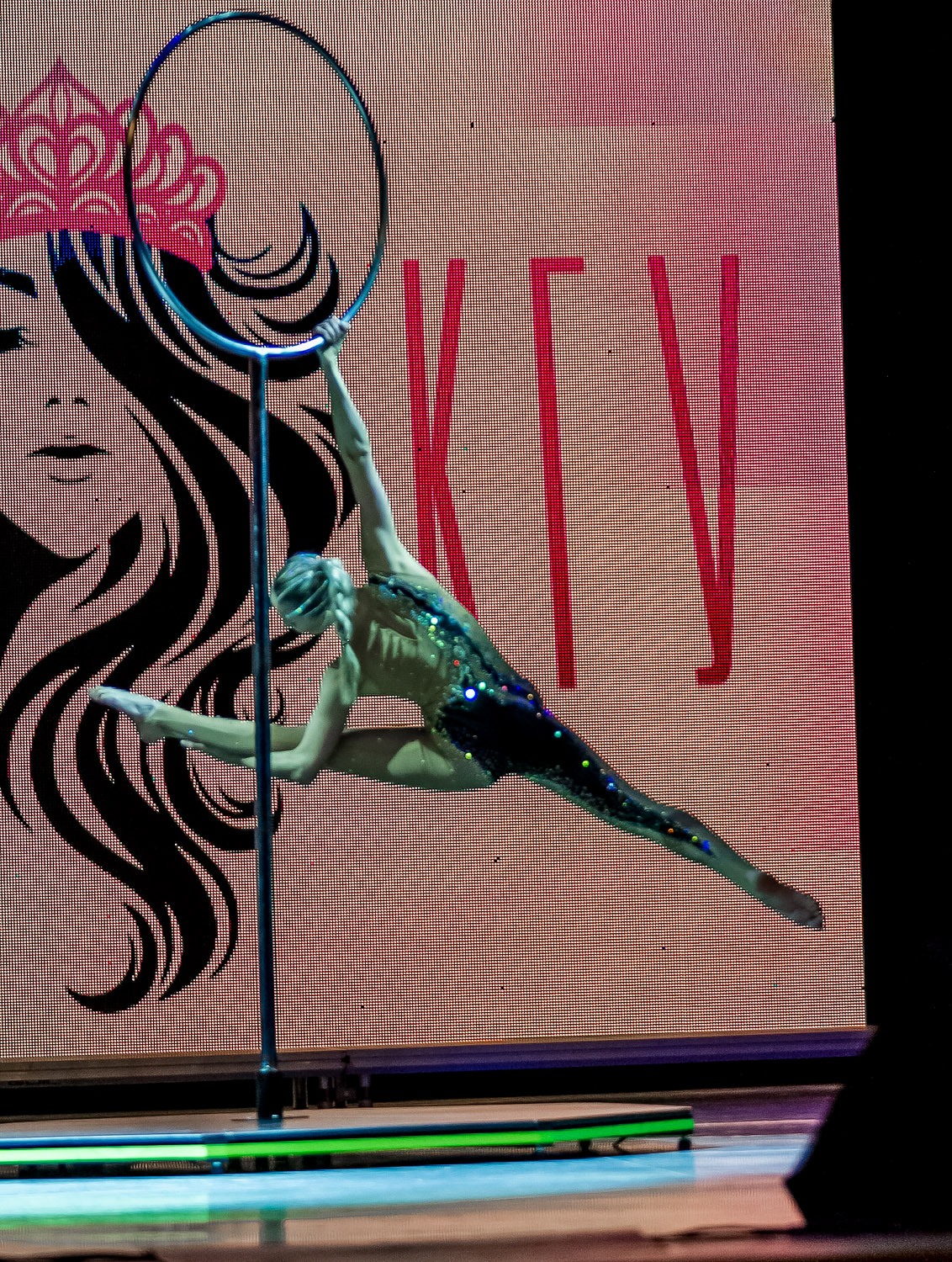 В перерыве на сцену внесли конструкцию с вращающимся обручем, чтобы своё искусство смогла продемонстрировать артистка цирка Ирина Носова. Её эффектный акробатический номер под чувственный блюз был действительно хорош.
