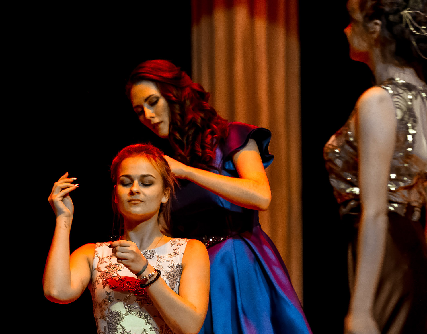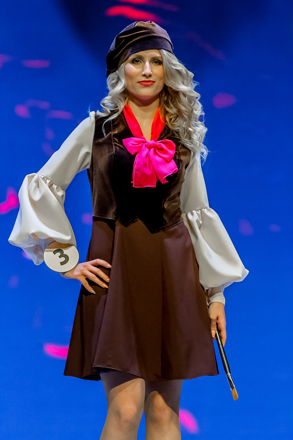 Номер участницы от физтеха Аполлинарии Гришиной сначала немало озадачил и показался постмодернисткой шуткой. На сцене началось некое дефиле в дефиле, появились стилисты и было совершенно непонятно, что вообще происходит. Ясность внёс ведущий, объявив, что Поля сама сделала причёски всем вышедшим в её номере девушкам.