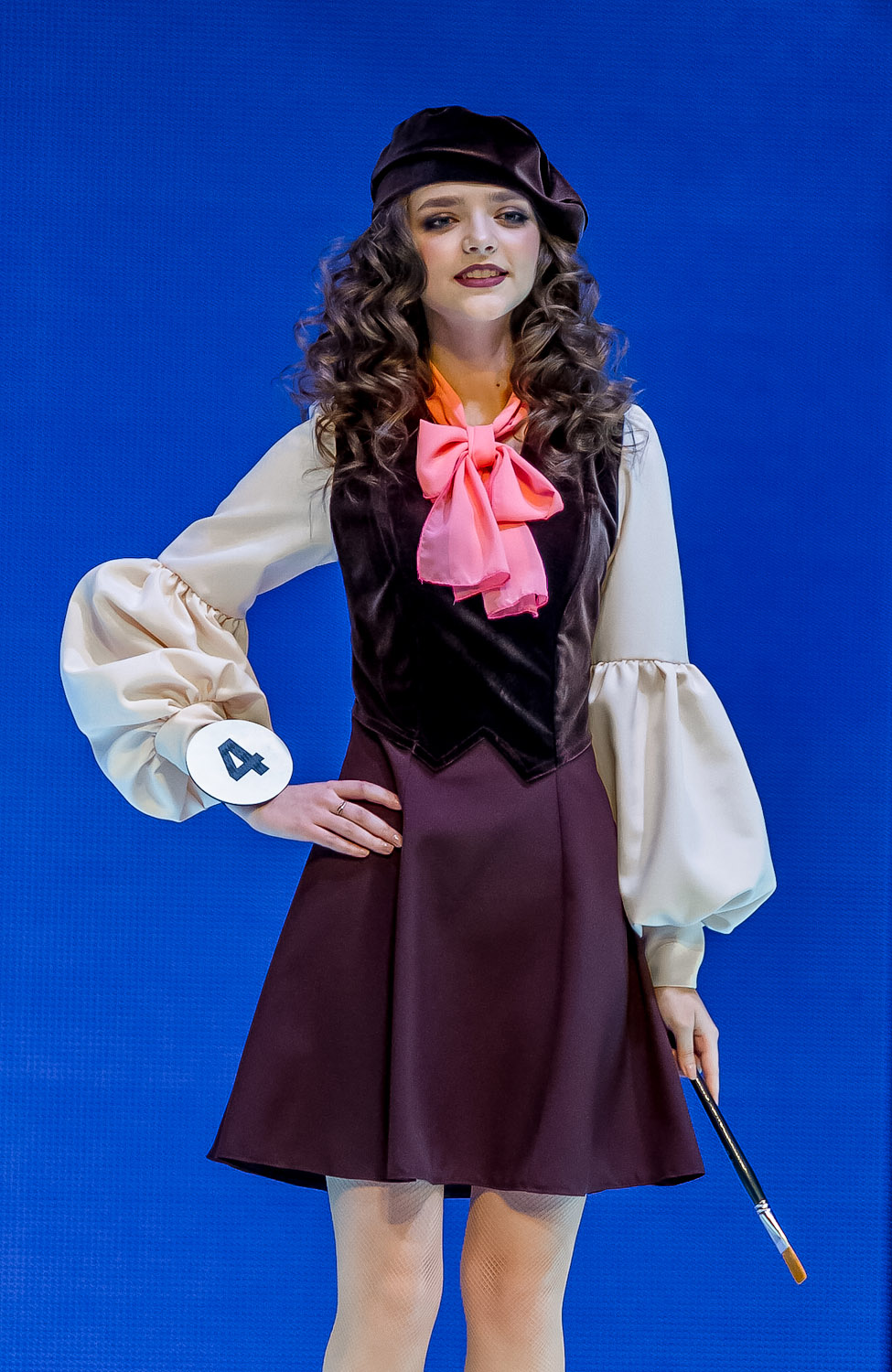 В своём первом дефиле девушки предстали в образах художниц, получившихся путём добавления к школьной форме кисти и берета.