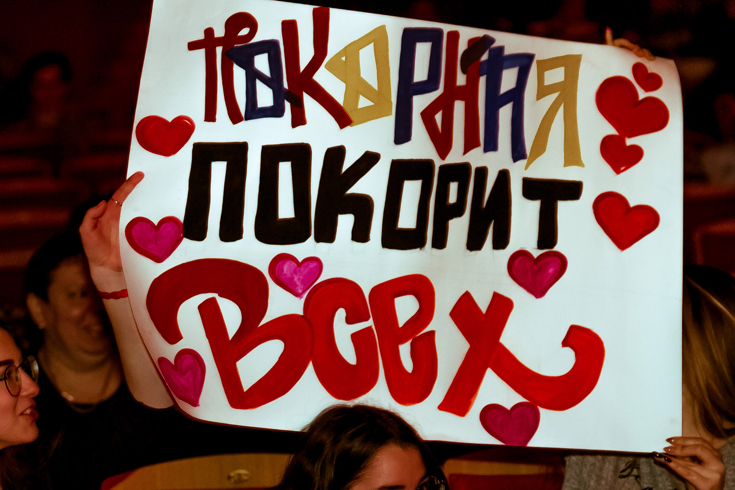 Спеть решила и Дарья Покорная, причём собственную песню. При этом Даша попутно продемонстрировала и свои таланты в каллиграфии. Кстати, у филфака была, пожалуй, самая сильная поддержка из зала. Каждое появление Дарьи встречалось одобрительными криками из зала, а на плакатах обыгрывалась её фамилия.