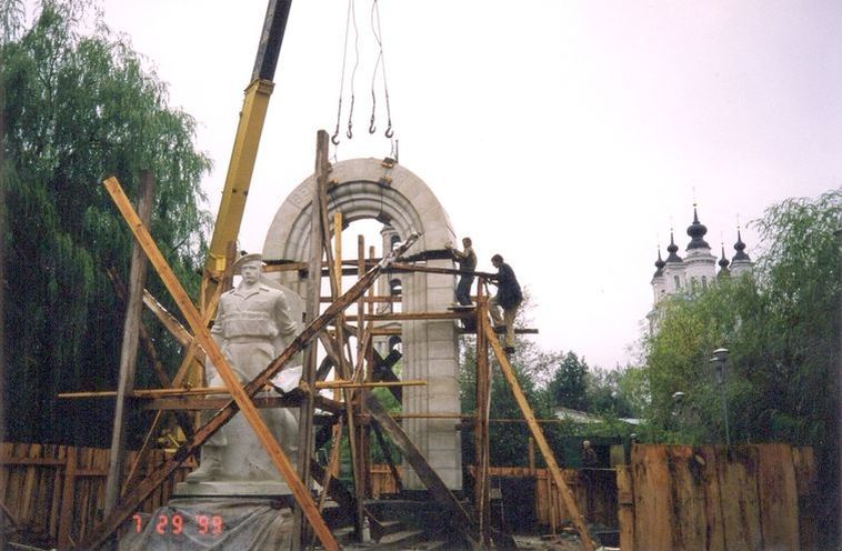 Мощный силуэт скульптуры выделяется на фоне декоративной арки. Именно она соединяет монумент с храмом невидимой осью, создавая таким образом целостную композицию с ним.