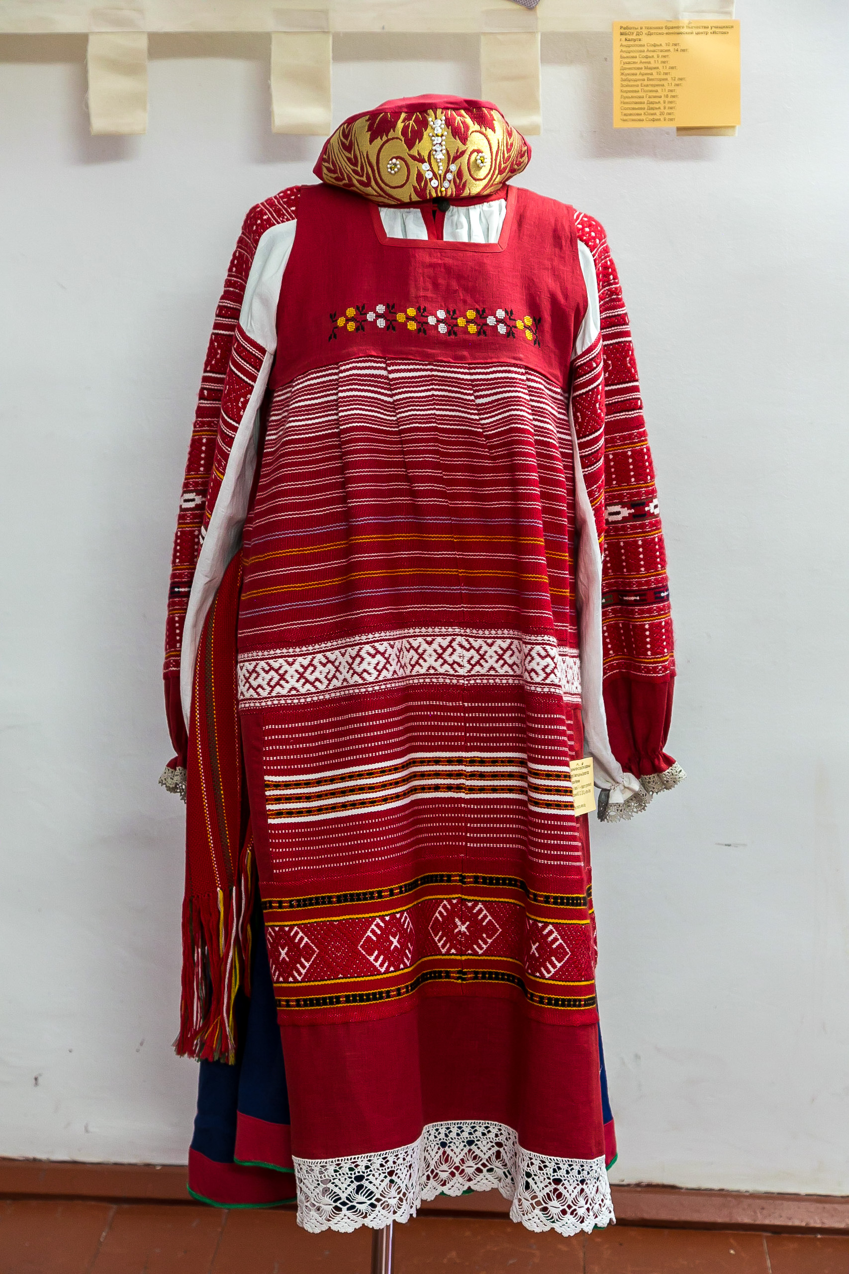 Сарафан пришёл позже, это северный тип одежды. Носили его с кокошником. Николай II подарил Румянцевскому музею кокошник Калужской губернии с шишечками, так называемый шишак. По количеству шишек можно было судить, сколько у пары детей.