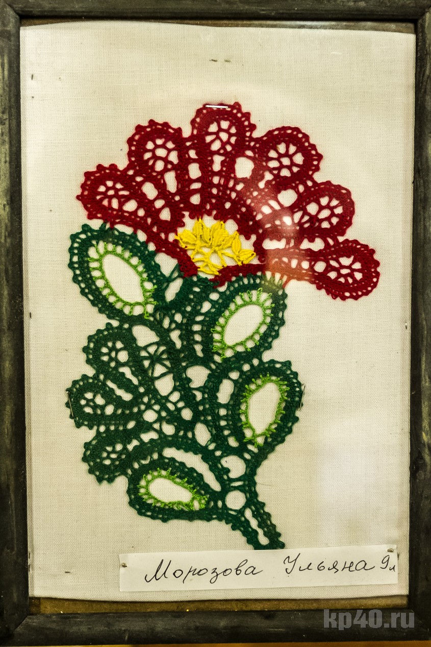 — Это салфеточка, на ней изображены кусты. Я начала заниматься только летом. Сначала нравился квиллинг, я делала картины из бумаги. Потом бросила. Увидела, как Лиза работает, тоже захотелось, но я боялась. Лиза привела меня к Елене Михайловне, помогала. Но я долго не могла купить коклюшки. Ездила в Москву с родителями, купили там, но они оказались плохие. Потом заказали в Интернете.