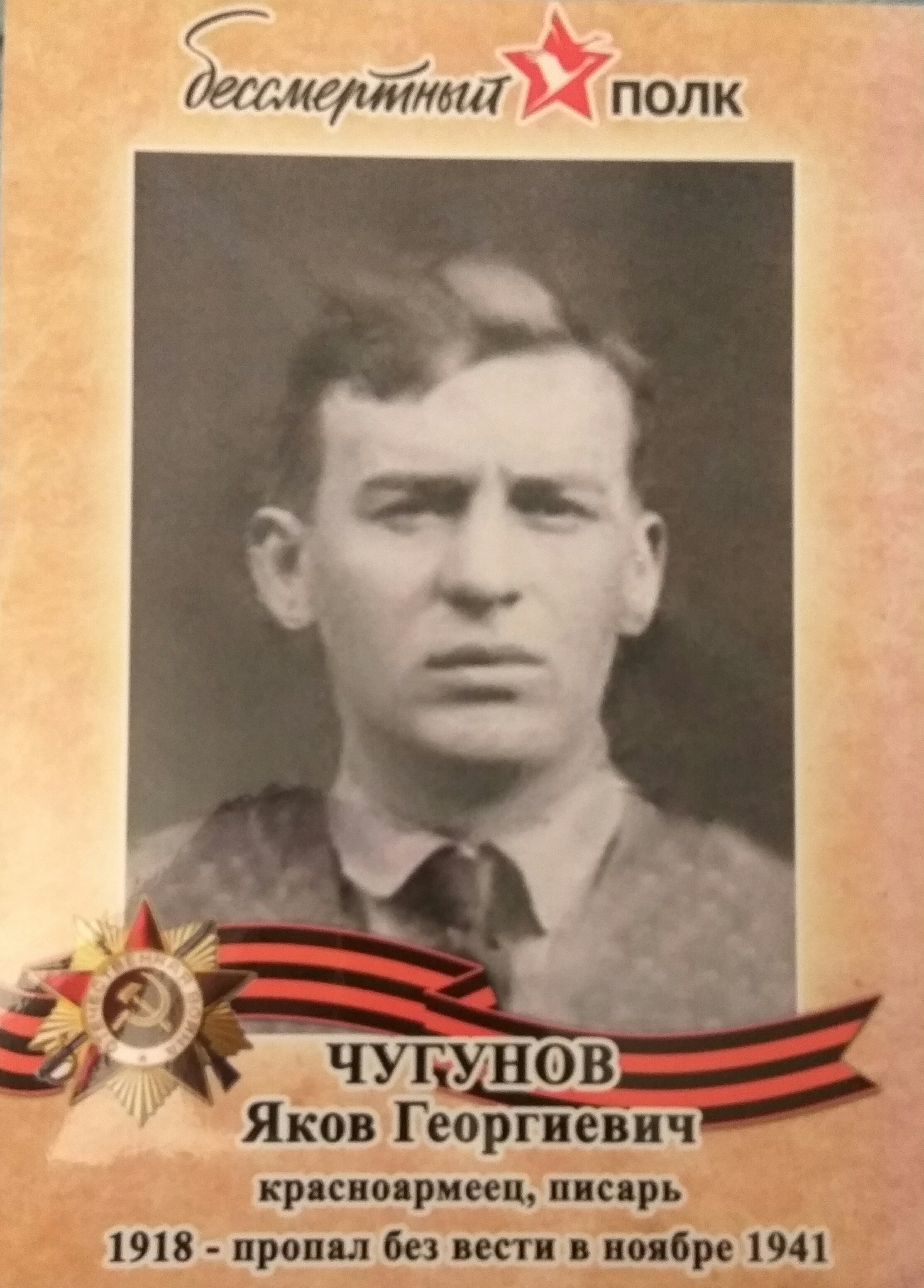 Мой дедушка по папиной линии Яков Георгиевич Чугунов родился в 1918 году в деревне Колтёнки Бабынинского района. Тогда он входил в состав Тульской области. Ушёл на войну по первому призыву. И с тех пор семье о нём ничего не было известно. Как в воду канул. О том, что дед пропал без вести в 41-м, мы узнали лишь много лет спустя из справки о потерях, когда стал доступен ОБД «Мемориал». Только тогда я узнала, что мой дедушка, Яков Георгиевич, служил красноармейцем в 195-м АЗСП (армейский запасной стрелковый полк) в должности писаря. Фотографий тогда было мало, а что и были, во время войны потерялись. И хотя бы примерно где погиб дед, мы не знаем. Я писала в «Забытый полк». Там подсказали, где можно попробовать найти хоть какую-то информацию. Единственная фотография, которую я бережно храню, — это фото с пропуска. Больше о дедушке мы ничего не знаем.