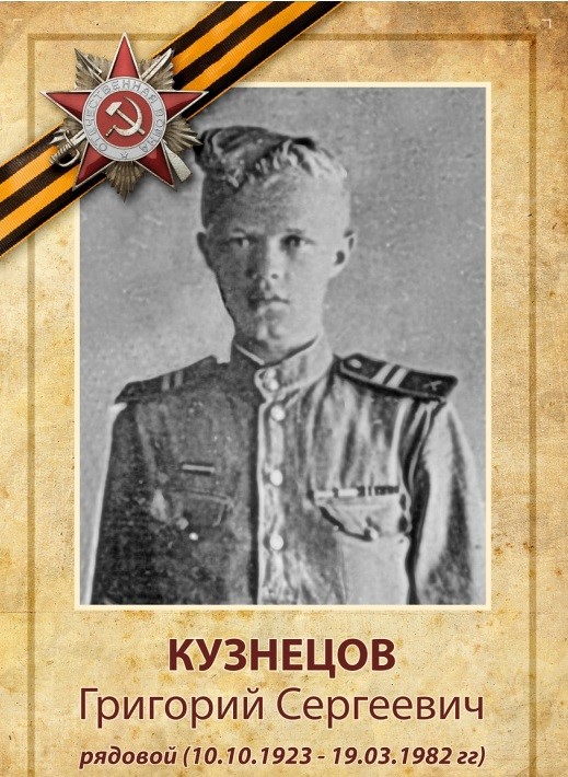Мой прадедушка Григорий Сергеевич КУЗНЕЦОВ родился в деревне Ивашево Калужской области 10 октября 1923 года. После школы он пошёл учиться в Гидромелиоративный техникум. 1 марта 1942 года его призвали на войну, ему только исполнилось 18 лет. Красноармеец Кузнецов принимал участие в боях за Зайцеву гору. Впоследствии в составе 144-й воинской части дошёл до Восточной Пруссии. Прадедушка был вычислителем батареи топографической разведки. 1 декабря 1944 года он совершил личный боевой подвиг, за что его наградили медалью «За отвагу».