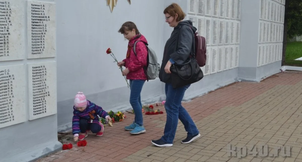 4 мая. Калуга. Мемориальное воинское кладбище. С гвоздиками в руках идут трое — женщина и две девочки.