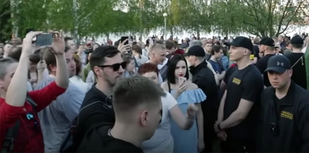 Группа «спортсменов» движется по огороженной сеткой территории с иконой. «Интеллигенты» напирают на ограждение. Бойцы Росгвардии в качестве зрителей наблюдают за действием со стороны. Впрочем, участниками драмы пришлось стать и им — сообщается о десятках задержанных интеллигентов.