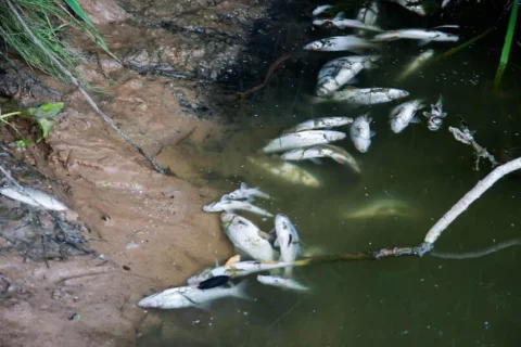 Там в реке подохло море рыбы, она плавает кверху брюхом в больших количествах. Вода сильно пахнет.