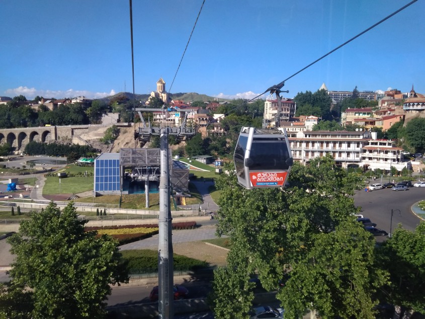 От парка рукой подать до канатной дороги, ведущей к горе Мтацминда, где находится древняя крепость Нарикала. Стоимость поездки по канатке в одну сторону — 2,5 лари, почти 60 рублей. Вид из кабинок на город открывается потрясающий. Пожалуй, только здесь можно охватить взором сразу два берега Куры и поразиться тому, как встроены в горы дома и храмы.