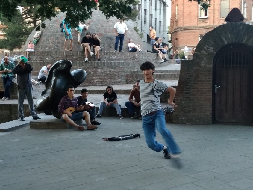 В один из вечеров мы прогуливались по Тбилиси и заметили за Сухим мостом сквер, в котором стоят кувшины из-под вина и бочки, выдолбленные из цельного ствола дерева. Конечно, мы тут же достали телефоны и стали всё это фотографировать. В это время к нам подошёл мужчина и с гордостью заявил, что это он таким образом решил украсить сквер.