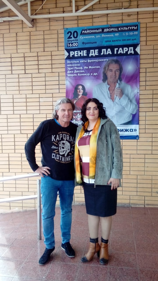 В Сухиничах я долго работала музыкальным педагогом в детском саду, а ещё пела в церковном хоре и сейчас веду сайт храма. Потом, особенно после больницы, стала понимать, что время уходит, а я ничего не сделала. И записала свой альбом. Он вышел в начале 2019 года. Возобновила концерную деятельность. Мы пригласили в Сухиничи и в Козельск — в группу «Маки», в первом отделении пела я. В июне выступала на празднике аэроклуба «Нормандия – Неман». А ещё мы устроили совместный концерт с французским шансонье Рене де ла Гардом. Это было потрясающе! У Рене такая харизма! Даже мужчины вставали танцевать. Все сразу телефоны достали, давай снимать. И это человек высочайшей европейской культуры, интеллигент. И, хотя высоких нот певец не берет, он, как Джо Дассен, Шарль Азнавур... Вышел на сцену, и все зрители — его. 27, 28, 29 сентября мы хотим повторить его концерты, возможно, будет выступление и в Калуге. А мои сольные концерты пройдут 3 ноября в Козельске и 4 ноября — в Сухиничах. Всех приглашаю, приходите!