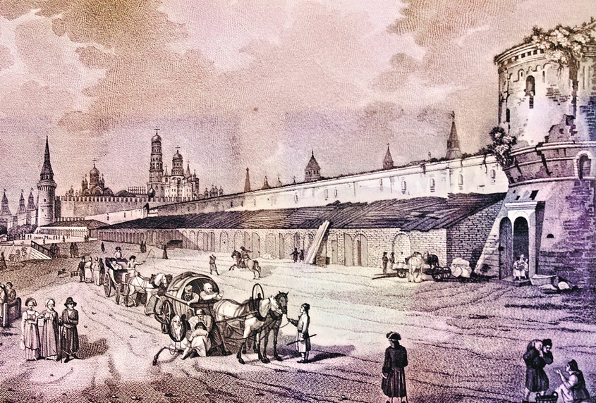 Вид Кремля, 1799 год. Кремлёвская стена соединена с низкой стеной Китай-города, одна из башен которой уже сильно разрушена. На переднем плане изображена упавшая лошадь, запряжённая в экипаж, к которой сразу кинулись слуги.
