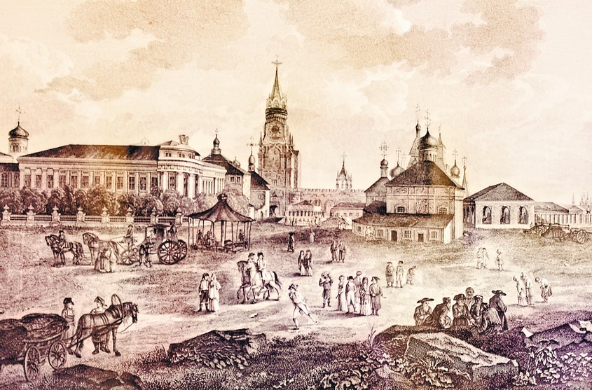 Вид Спасских ворот, 1799 год. На переднем плане — развалины, так как площадь расчищалась, строились новые здания.