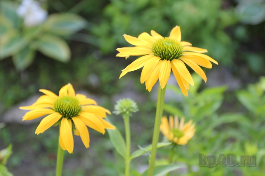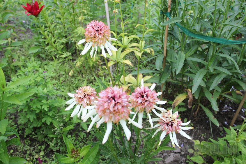 — Мои новинки — эхинацея «мандарин», «шампань», — рассказывает цветовод. — А здесь растёт ярко-жёлтое растение с крупными соцветиями — «лейлани». «Клубника со сливками» — интересный сорт с белоснежными лососево-розовыми помпонами. Эхинацеи, как ромашки, надо обязательно каждые три года делить. За это время у них вырастают мощные корни. Если этого не сделать, цветы могут пропасть.