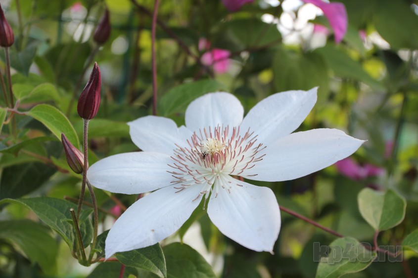 При входе на участок сразу же бросаются в глаза ковры цветов: белые, сиреневые, малиновые. У одних цветки чем-то похожи на гвоздику, у других — на колокольчики. Они отличаются не только по форме и цвету, но даже по запаху. Клематис «балерина» достаточно высокий с нежными, крупными белыми цветами, «кайзер» — с махровыми соцветиями. Ещё совсем молодой фиолетовый клематис «виктория» — мелкоцветковый. Через пару лет он будет весь усыпан цветами.