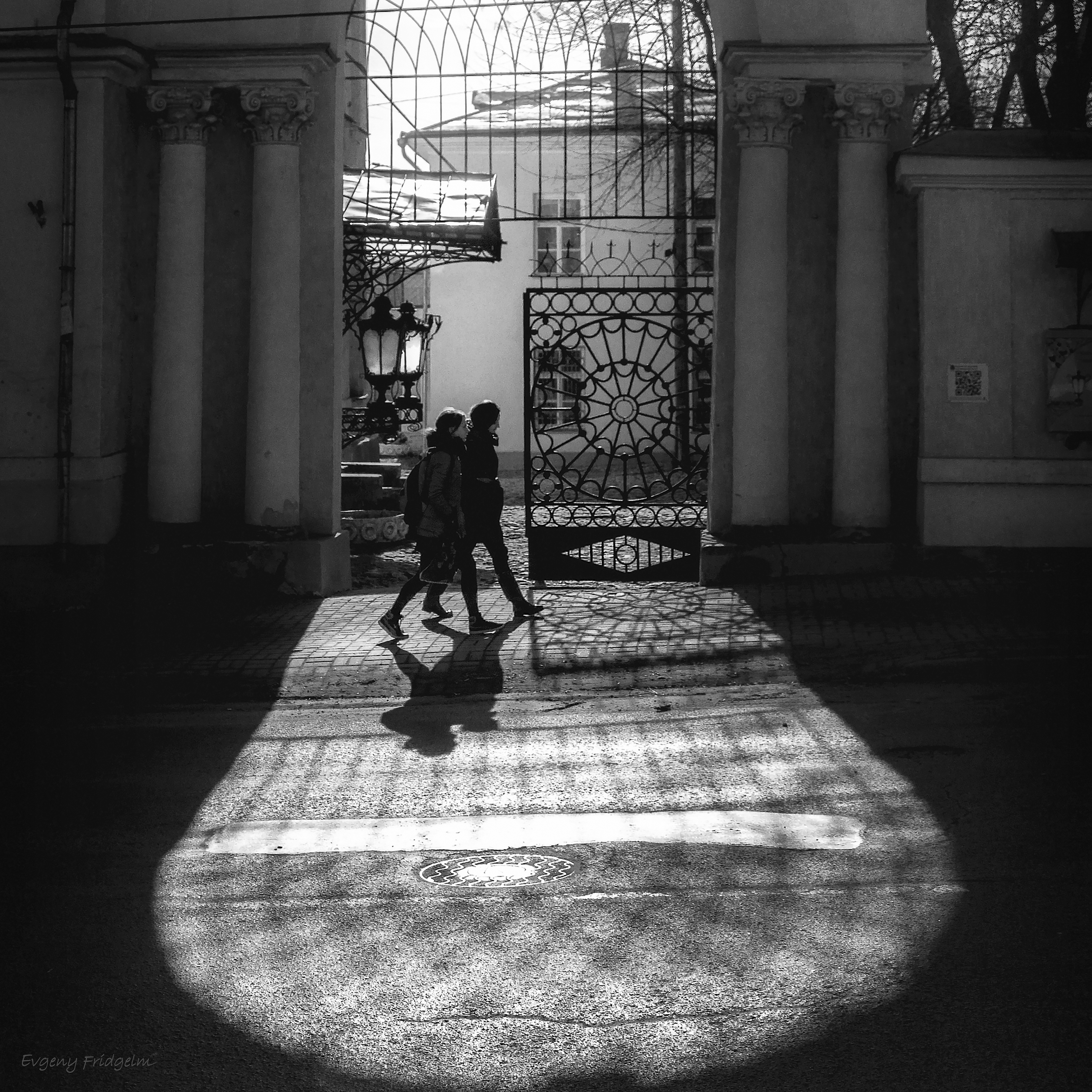 У меня есть фото: главный вход в Калужский краеведческий музей — ажурные ворота, фонари… Ближе к вечеру, когда солнце оказывается напротив фонарей и бьёт оттуда на улицу, ажур решёток отражается на асфальте проезжей части. Но просто тень снять — скучно. Стал ждать. И когда прошли две девушки, их длинные тени легли на тень решетки, кадр оживился. Надо просто знать, что ты хочешь получить в итоге.
