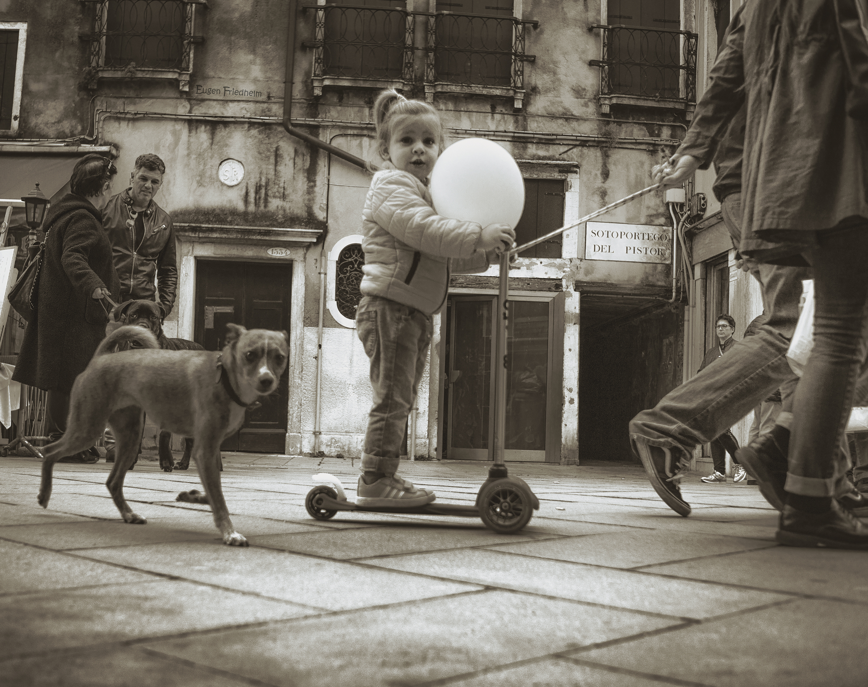 — Раньше, чтобы запечатлеть какое-то место или здание, я терпеливо ждал, когда народ разойдётся и не будет заслонять красоту. Сейчас, наоборот, жду, чтобы кто-то в кадр вошёл. Фотограф, как шахматист, должен думать на шаг вперёд. Например, в Венеции я наблюдал такую картину: навстречу идут родители и за верёвочку тянут самокат, на котором едет маленькая девочка, а за ней бежит собачка. Я присел на корточки, стал ждать. И сделал удачный кадр: в какой-то момент и девочка посмотрела в камеру, и собачка, и ещё на заднем плане мужчина и собака оглянулись. Такие удачные моменты можно спрогнозировать.