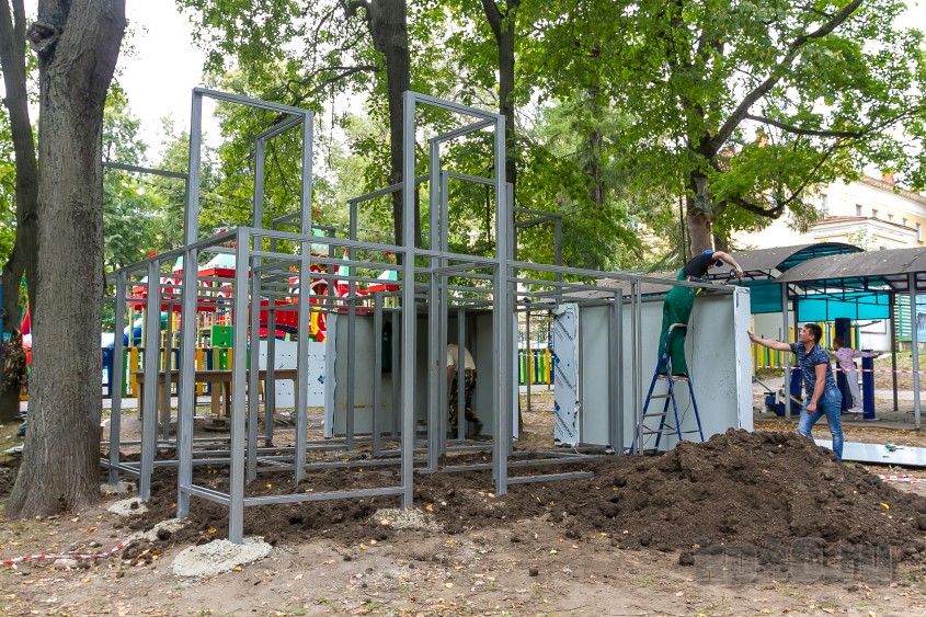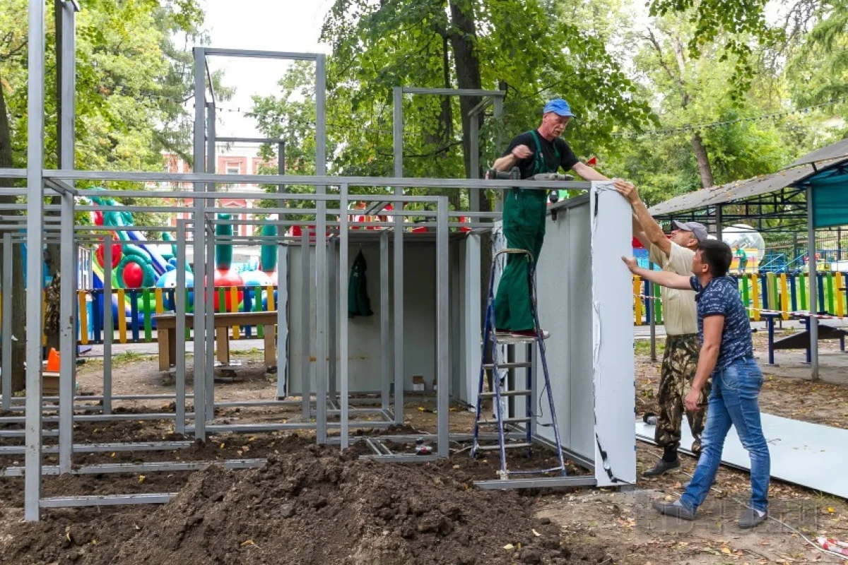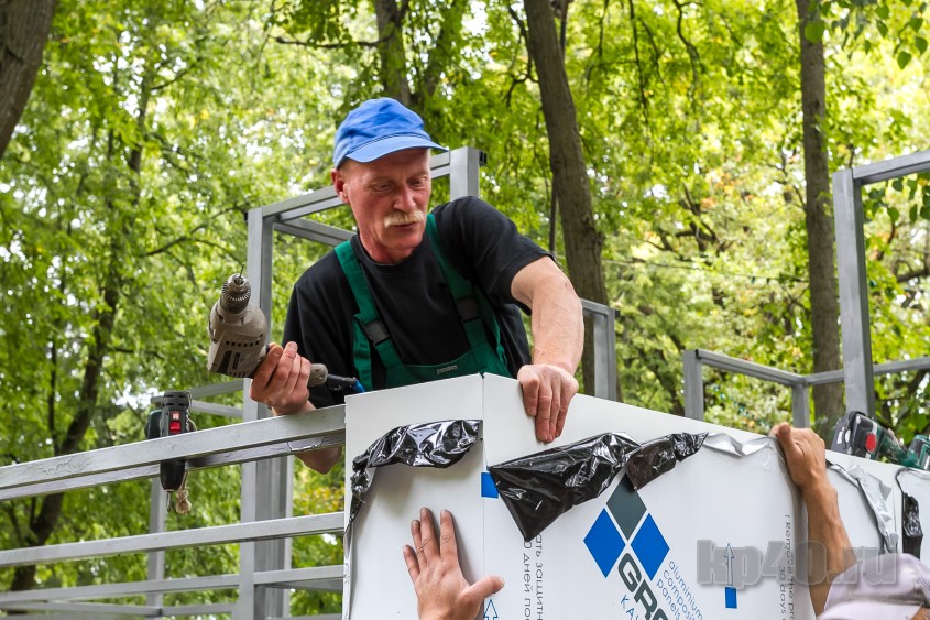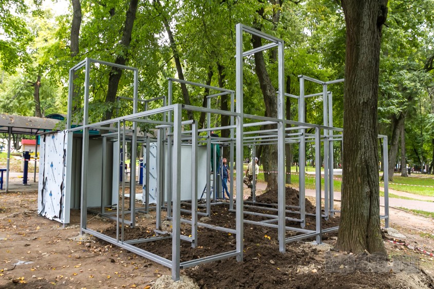 В калужском парке культуры и отдыха рабочие начали собирать лабиринт. Днём во вторник, 13 августа, уже был готов каркас конструкции, начался монтаж стен.